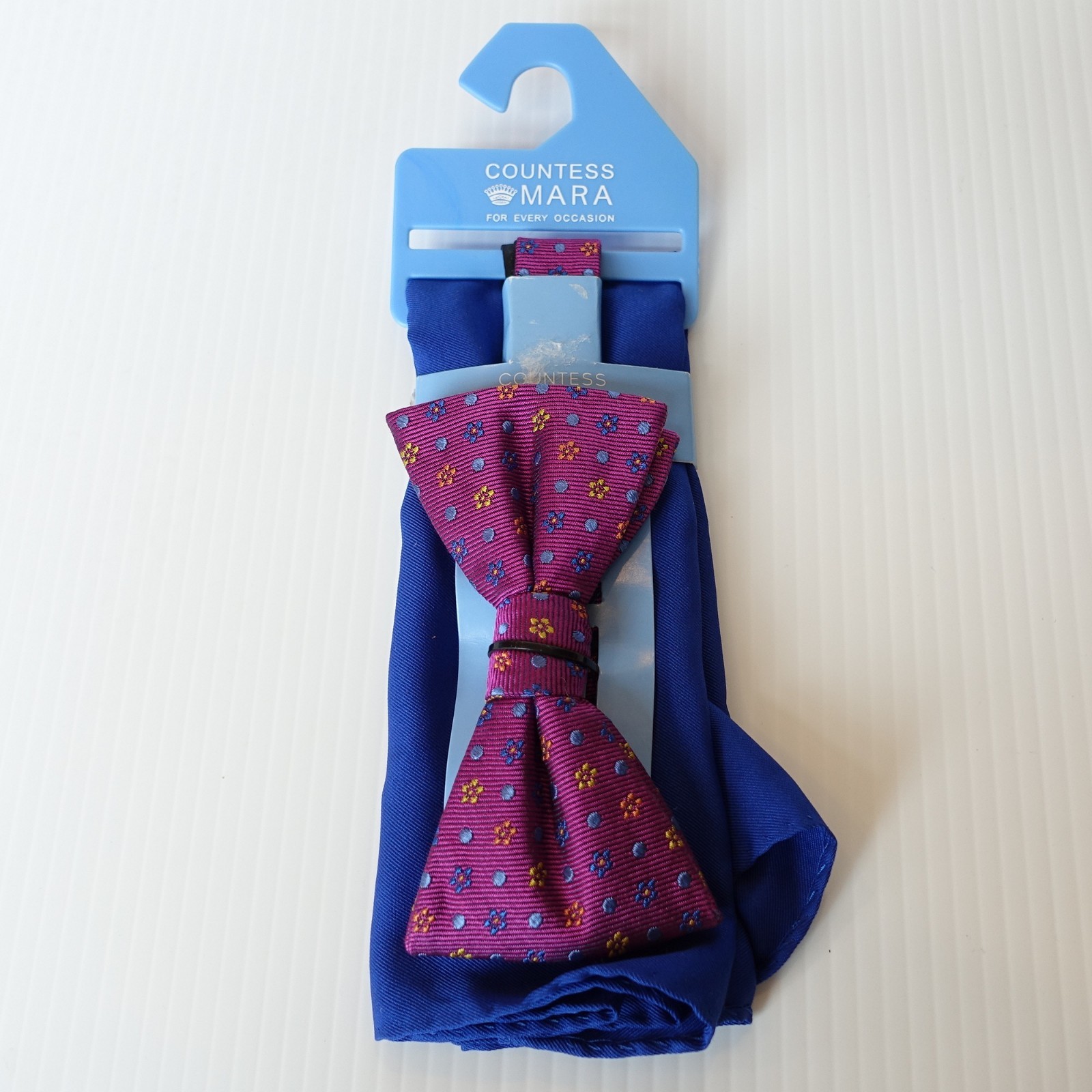 - COUNTESS MARA Purple Floral Neat Pre-Tied Bow Tie Blue Solid Pocket Square Set