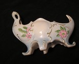 Offered for your buying pleasure is a unique Coventry porcelain planter/vase made in the USA with 5508B stamped on the bottom. The body of the vase is a bluish cream color. This vase has hand-painted pink flowers and green leaves. There is gold outlining around the vase. The vase is free from chips and cracks. Measures 8.5" x 6.75" x 4".