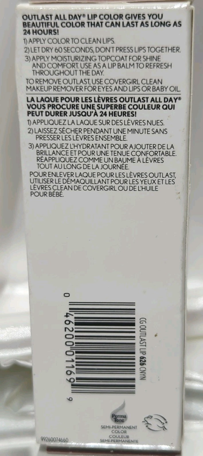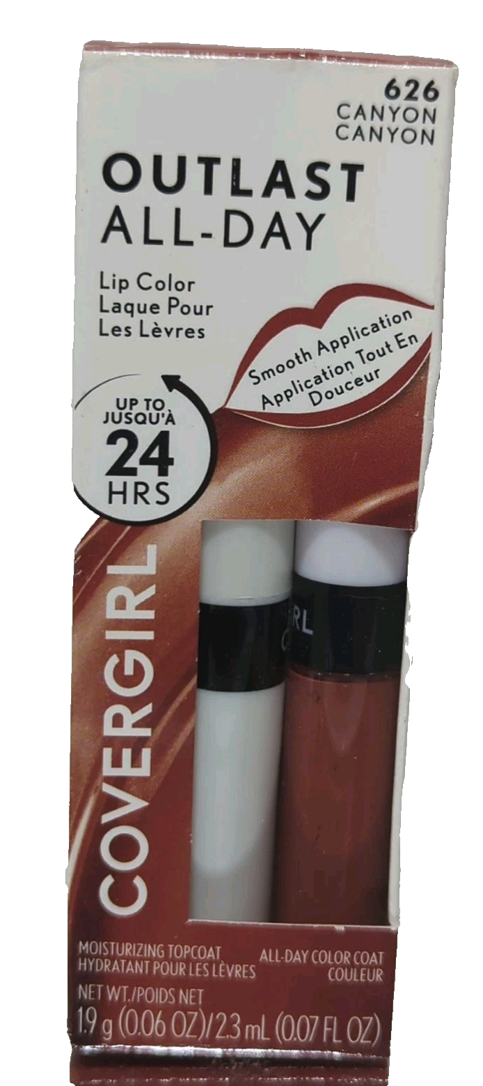 Achieve bold, lasting color with CoverGirl Outlast All-Day Lip Color in Shade #626 Canyon. This 2-piece set includes a richly pigmented color coat and a moisturizing topcoat for up to 24 hours of comfortable, smudge-resistant wear.