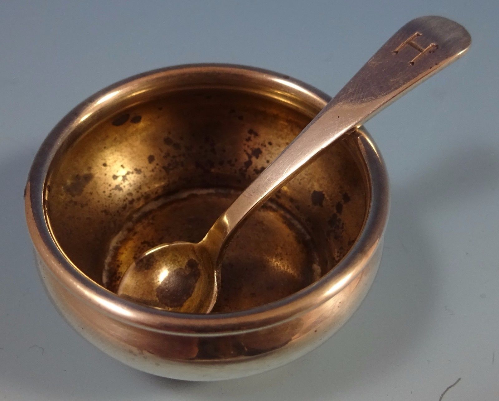 Covington by Gorham sterling silver salt dip with spoon. The pieces have a monogram "H" (see photos), and they are marked with #A4070. They have date mark for 1925. The salt dip measures 2" x 1 1/2" and weighs .50 ozt., and the spoon measures 2 1/4". Salt pitting and monogram can be removed with professional polishing. The set is in excellent condition.