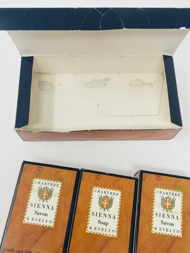 for a set of 3 Crabtree and Evelyn Sienna soap bars. 3.5oz size. They all have a marking at the edge of the bar were it rested in the box. I do not know if this is due to age/temperature/dye transfer or what. But they are all new and unused.