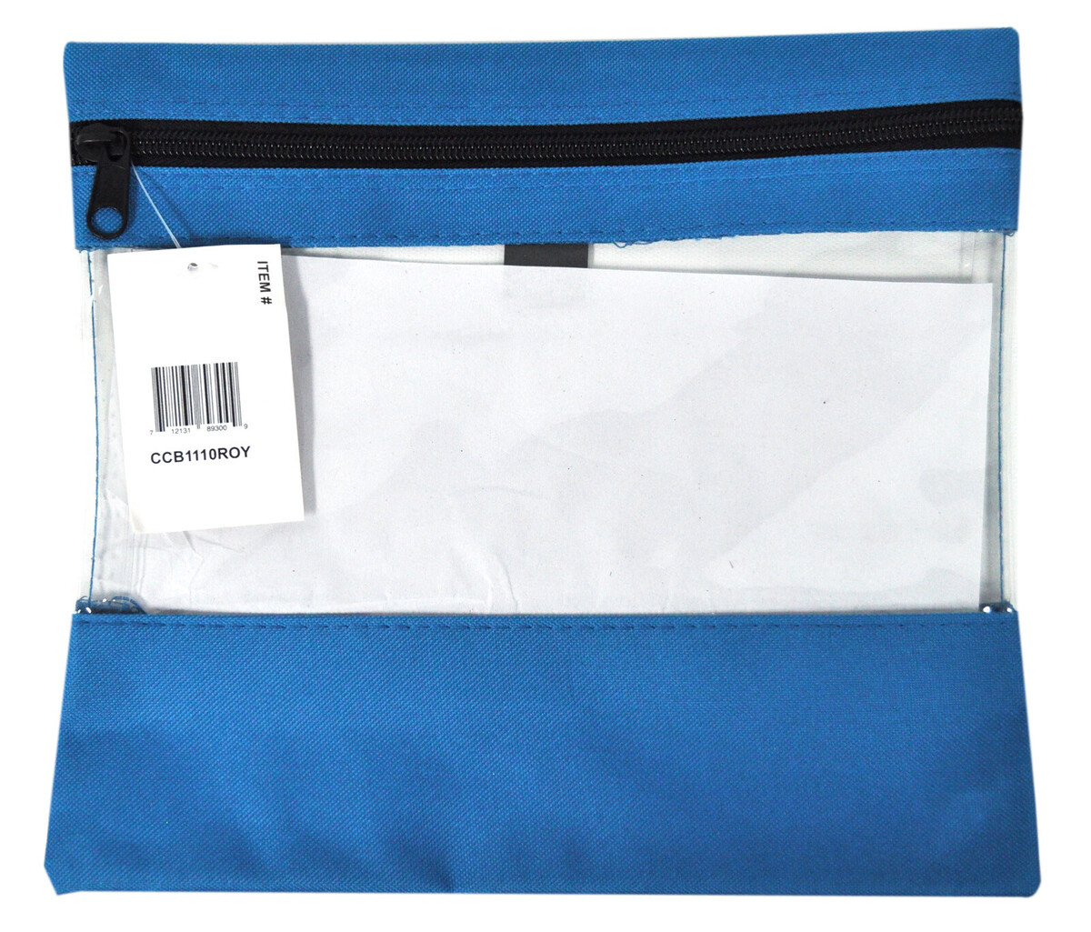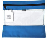 Clear plastic body with royal blue polyester trim. Zipper closure.
