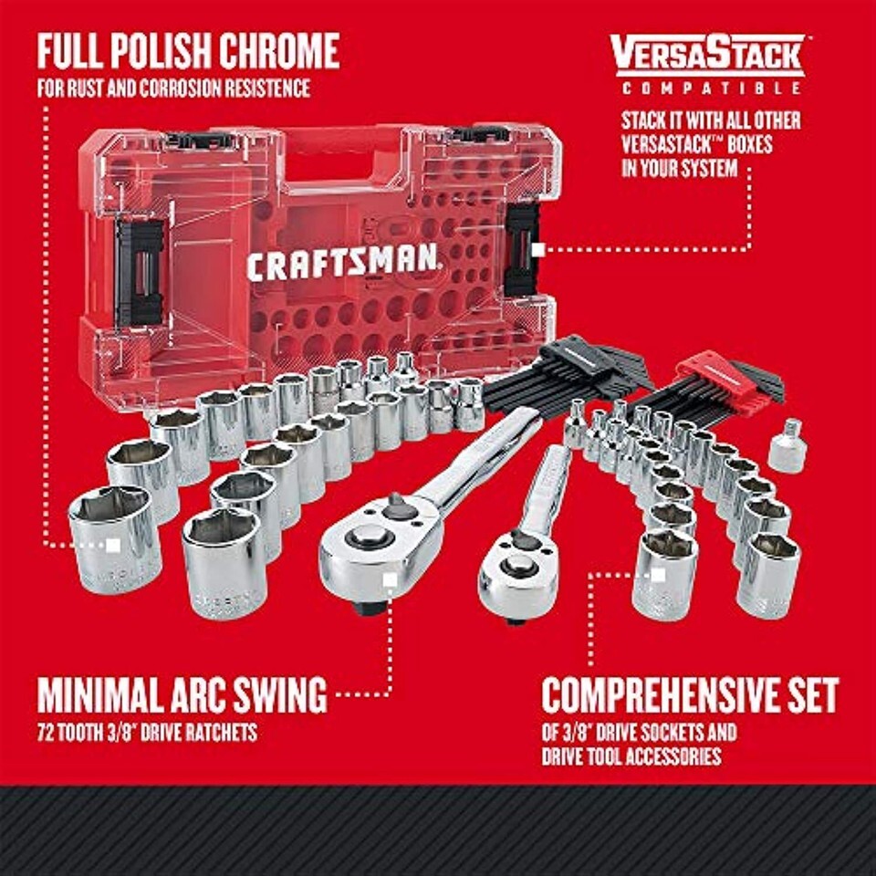CRAFTSMAN 71-piece VERSASTACK Mechanic Tool Set is a comprehensive 1/4-in and 3/8-in drive mechanic tool set that integrates seamlessly into the VERSASTACK System. An ideal set to incorporate into an existing arsenal of tools, or great starter set. This set features Craftsman's 72 Tooth 1/4-in and 3/8-in Drive Quick Release Ratchets (CMMT81747 and CMMT81748) which provides users with an ideal balance between durability and accessibility. All tools meet or exceed ASME specifications and are backed by Craftsman. Take on your next project with Craftsman's Full Polish Chrome 71-Piece VERSASTACK Mechanics Tool Set.