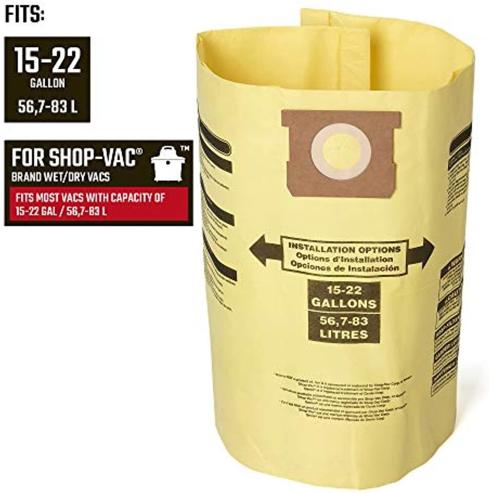 The CRAFTSMAN 15 to 22 Gallon Fine Dust/Drywall Dust Collection Bags for wet/dry vacs are designed for pick-up of drywall dust, cold ashes, ultra-fine particles and other dry debris pick-up. These filter bags fit most 15-22 gallon Shop-Vac brand vacs. Trap debris conveniently with these dust collection bags for easy disposal. Bags are easy to install by attaching to vacuum port inside tank without needing tools and are even easier to toss away. Includes 2 dust bags. This is NOT a product of, nor is it sponsored or endorsed by Shop-Vac Corp. Shop-Vac is a registered trademark of Shop-Vac Corp.