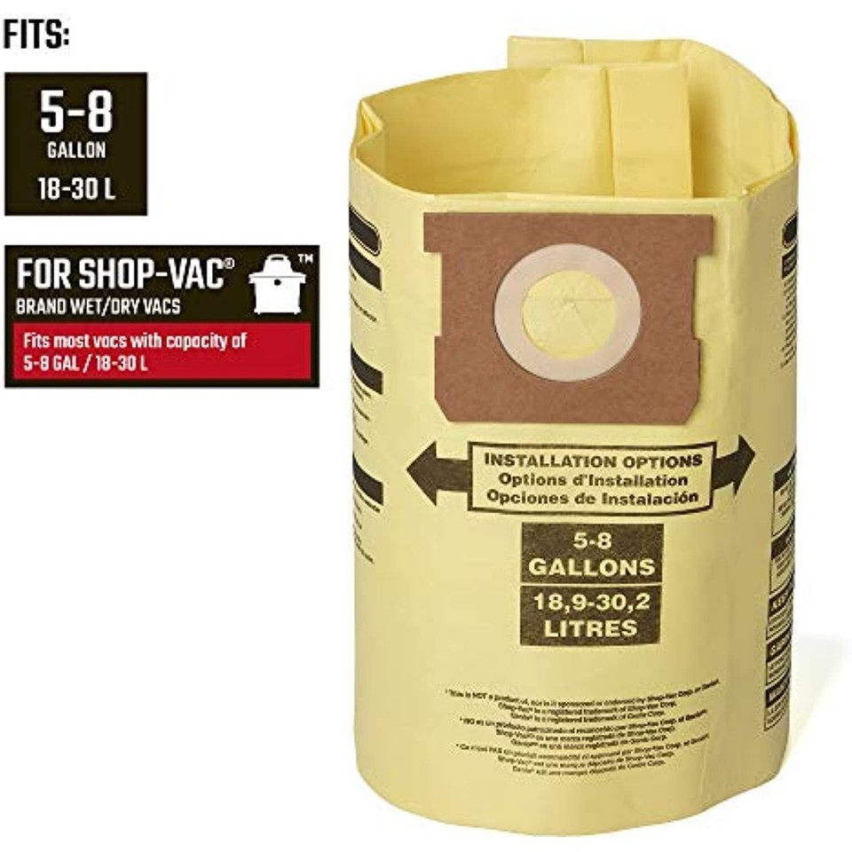 The CRAFTSMAN 5 to 8 gallon fine dust/drywall dust Collection bags fit Shop-Vac brand vacs and are designed for pick-up of drywall dust, cold ashes, ultra-fine particles and other dry debris pick-up. Trap debris conveniently with these dust Collection bags for easy disposal. Bags are easy to install by attaching to vacuum port Inside tank without needing tools and are even easier to toss away. Includes 2 dust bags. This is not a product of, nor is it sponsored or endorsed by Shop-Vac Corp. Shop-vac is a registered trademark of Shop-Vac Corp.