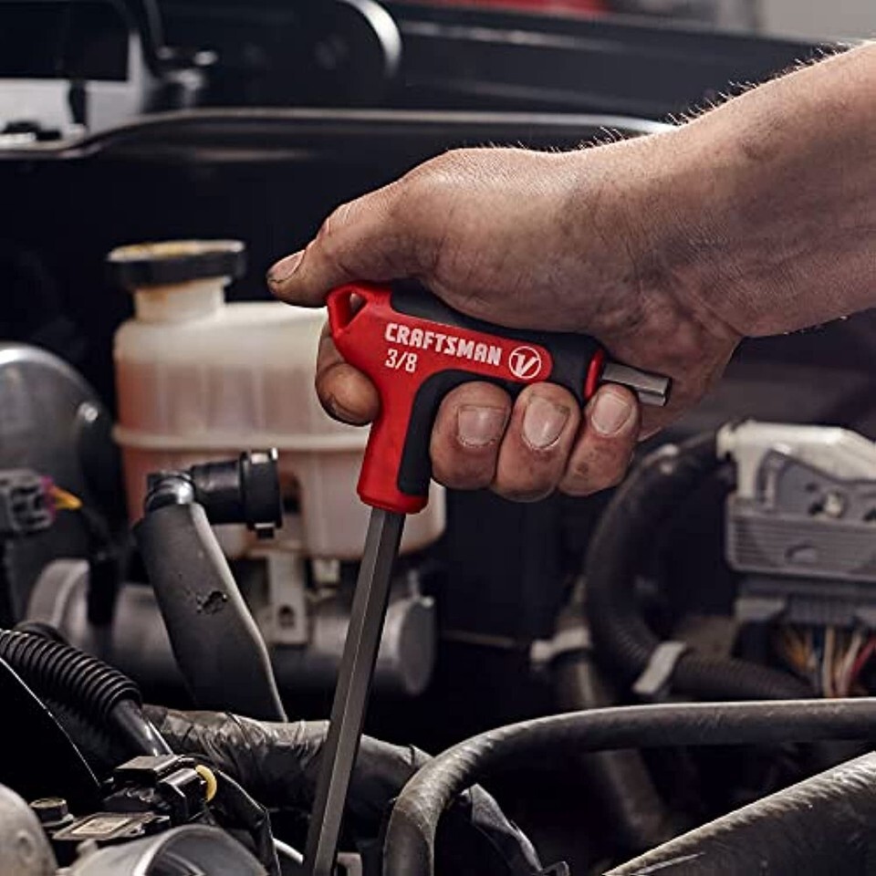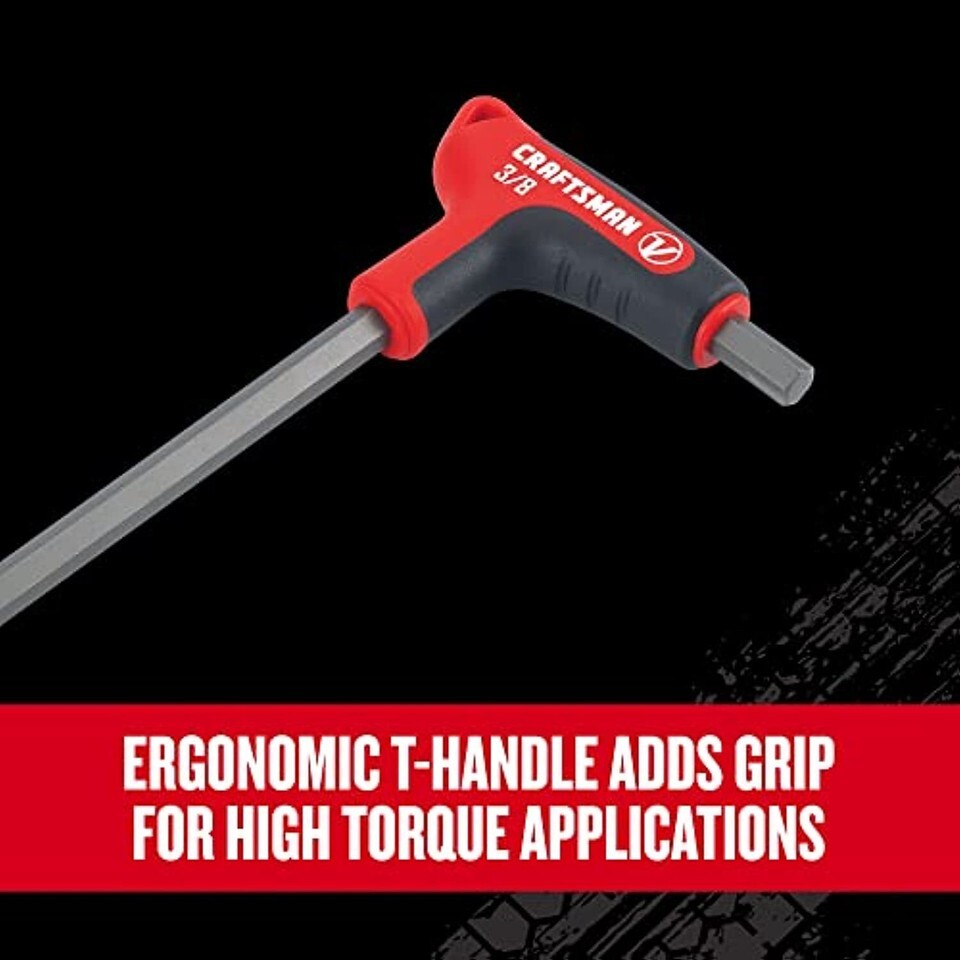 Craftsman V-Series tools are designed to professional specifications. With patented X-Tract Technology? , removing rounded or rusted fasteners just got easier. The Craftsman V-Series? 9pc X-Tract Technology? SAE T-Handle Set is designed to remove fasteners up to 50% rounded, while also helping to prevent rounding or stripping of new fasteners. The X-Tract Technology? grooves in the tip create additional engagement points for gripping and help to release stress on the interior of the fastener as you turn. Each key is also manufactured from premium S2 steel for strength and durability, with an ergonomic, over-molded handle for additional grip in high torque applications. This set includes 5/64", 3/32", 1/8", 5/32", 3/16", 7/32", 1/4", 5/16", 3/8"