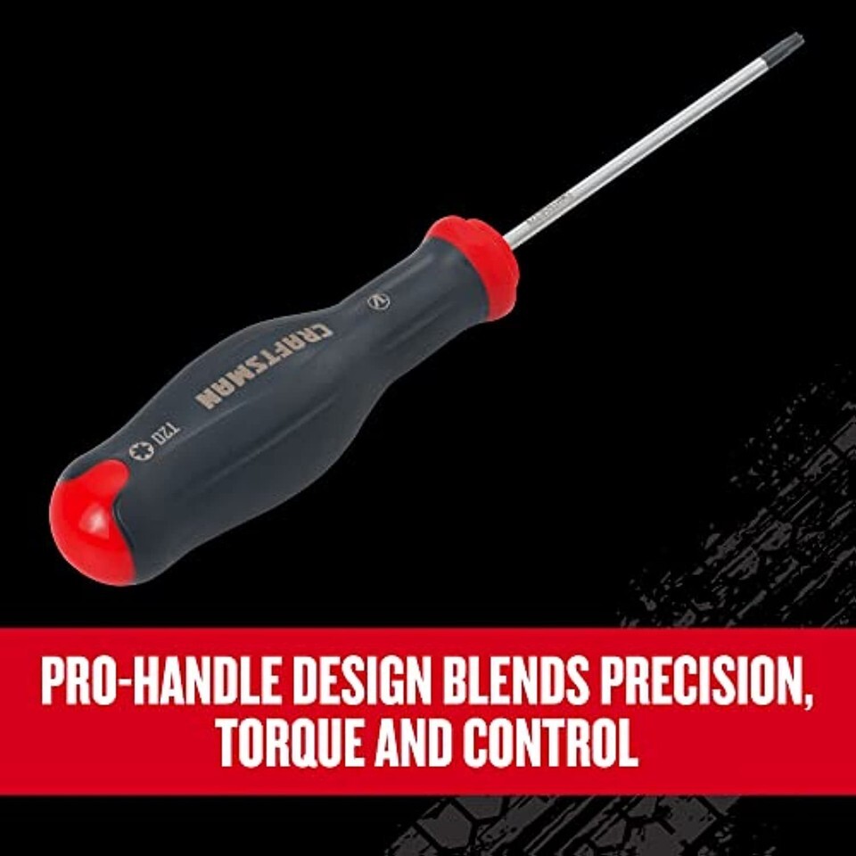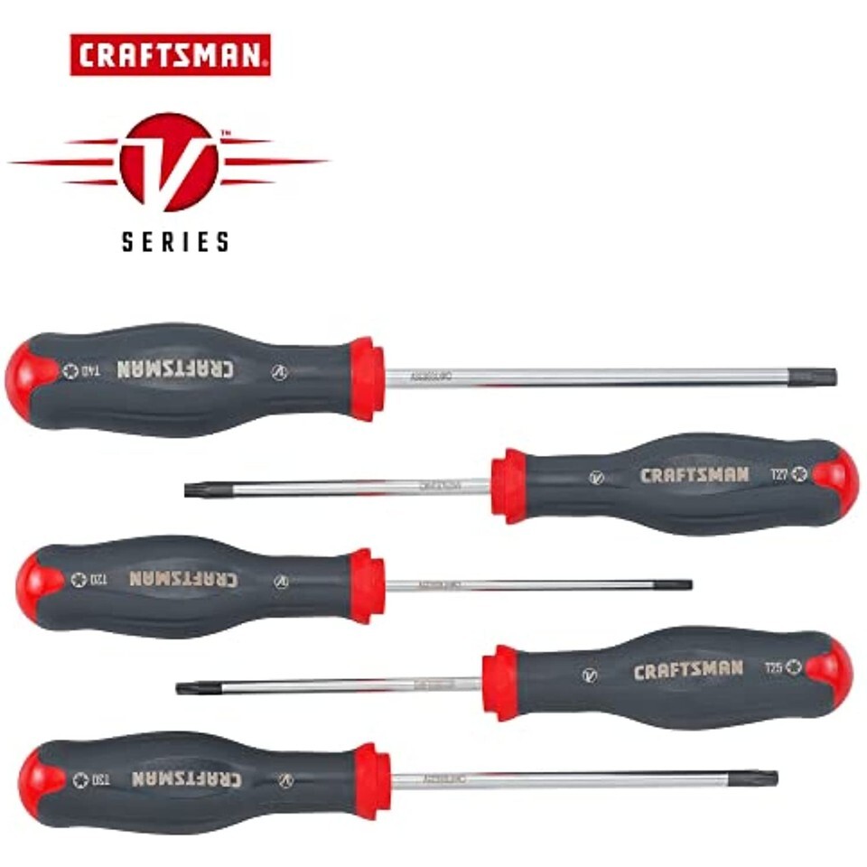 Craftsman V-Series tools are designed to professional specifications bringing tool truck quality within reach.The Craftsman V-Series 5pc Torx Screwdriver Set leverages precision machined tips and premium alloy steel to deliver professional grade durability. The handles are designed with the mechanic in mind blending precision, torque and control, with a soft touch material that offers comfort and verified 2x protection against the most common garage solvents. This set includes T20, T25, T27, T30, and T40