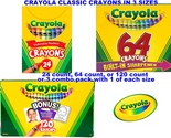 WELCOME TO MY CRAYOLA CRAYON STORE FEATURING CLASSIC SIZE CRAYOLA COLORING CRAYONS IN BOX SIZE CHOICES. THESE ARE THE REGULAR or CLASSIC SIZE GENUINE CRAYOLA BRAND COLORING CRAYONS MEASURING 3 5/8" LONG x 5/8" DIAMETER, CHOOSE 24 count, 64 count, 120 count OR, MY 3 COMBO PACK WITH ONE OF EACH SIZE TO SAVE ON POSTAGE. THESE ARE FACTORY FRESH, OLD SCHOOL STYLE CRAYOLA CRAYONS, NON TOXIC, MADE IN THE USA AND SUITABLE FOR CHILDREN AGES 4+. JUST GO TO THE CRAYOLA SIZE SELECTOR ABOVE AND MAKE YOUR SELECTION. FOR MULTIPLE ITEMS, PLACE YOUR SELECTIONS IN THE SHOPPING CART PRIOR TO CHECKING OUT. YOU WILL RECEIVE YOUR CRAYOLA BRAND CRAYONS SHIPPED BY USPS FIRST CLASS MAIL.....