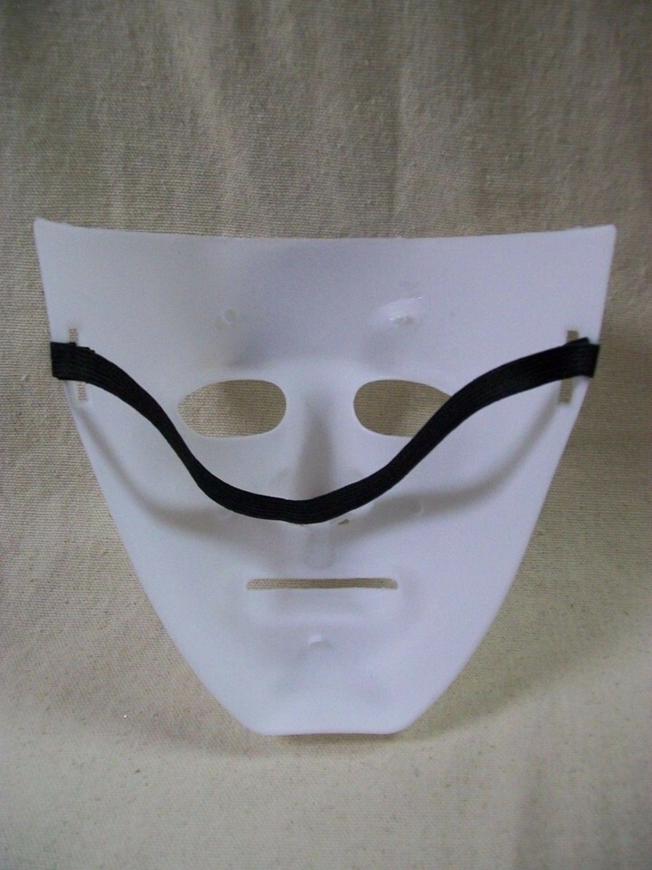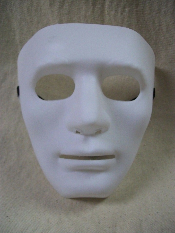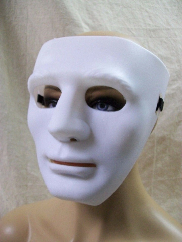 Plastic Costume Face Mask. Eerie Expressionless Face mask. Has an elastic strap that goes from side to side around back of the head. Be gentle with elastic as Hard tugging could cause it to come loose from the side. Not a full mask, only covers the front of the face like a shield. Heavier Molded Plastic. Finish is flat and may scratch or mark up easily. No age specs but most costume items are for ages 14 and up. DOES NOT INCLUDE MANNEQUIN.