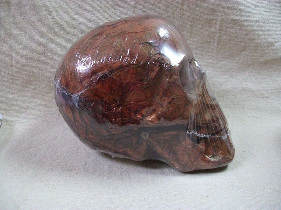 Creepy looking decomposed Skull. Supposed to light up but I think the batteries are bad. I tried one and it lit up for a few seconds. The lights aren't in the eyes like I thought they were. I wanted to see what it looked like in the dark but by the time I turned the lights off it quit. A creepy fun Halloween Prop, Costume Accessory or Decoration. Skull is lightweight so I think it is probably Foam and wrapped with some unknown material. Has an on/off switch. takes button type Batteries. Not sure what size it takes. There's a plastic pull tab in battery area. I'm not testing these as I am selling them as non-functional. SOLD AS IS. The skulls are in a plastic shrink wrap that should be removed prior to use, unless you want that kinda look. Great decoration for Halloween or a haunted mummy tomb, cave, morgue, cemetery theme. Could also be used as part of a costume like an egyptian mummy, grim reaper, dr. death, undertaker, gravedigger, etc.