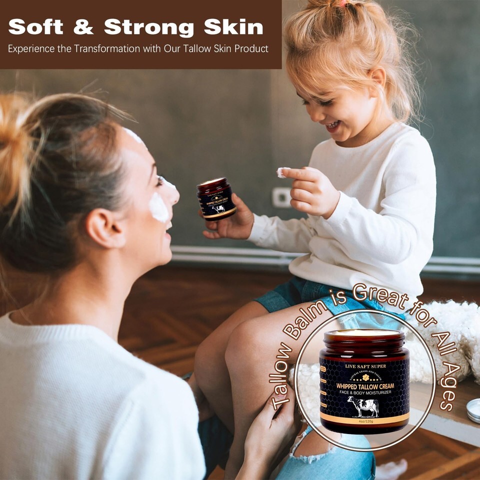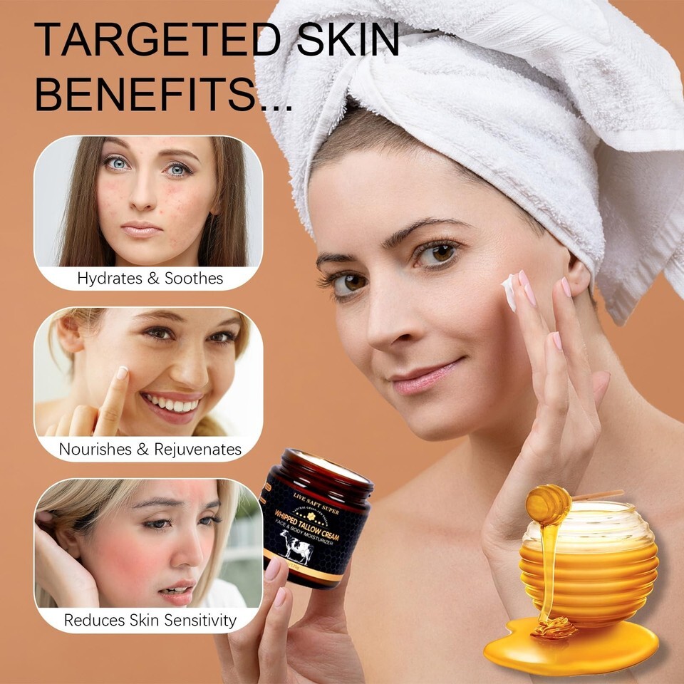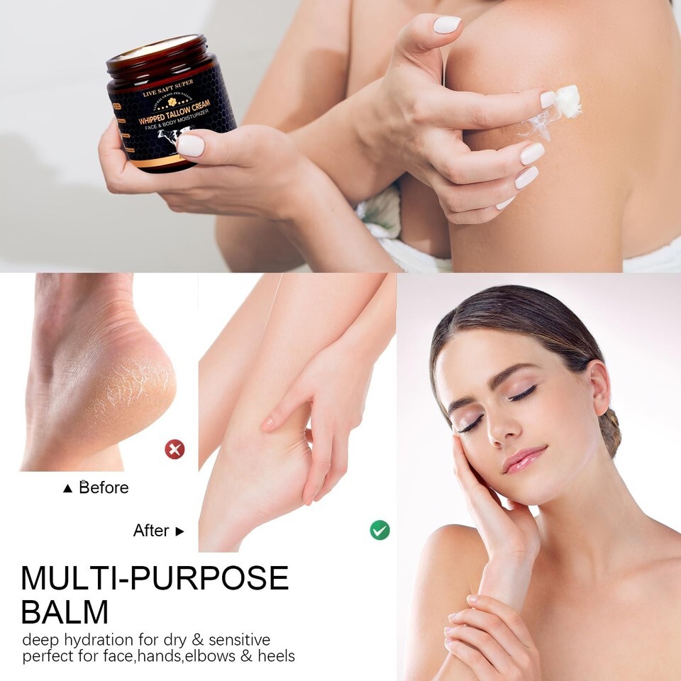 Solucion multiusos para el cuidado de la piel: versatil y eficaz, esta crema de sebo batida no es solo una crema hidratante facial, es una solucion de cuerpo completo para codos asperos, rodillas agrietadas y talones secos. El rico sebo de res para la piel crea una barrera protectora para suavizar los parches secos obstinados, revelando una textura mas suave de la cabeza a los pies.