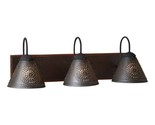 Here is a new classic country lighting fixture designed to illuminate your bathroom, This is called the Crestwood vanity light and it is made of wood and has attached punched tin shades,It has a hand painted and slightly distressed espresso with salem brick wooden back with black textured arms and crimped pans,It is Direct wired with three Medium (Standard) sockets, each taking up to 60 watt max. bulbs per arm. (Bulbs not included) it has Black textured arms with crimped pans, and punched kettle black tin shades, And it is Handcrafted in United States, This light is UL-CUL approved also. Below is full Description, this would accent any bathroom or powder room nicely, and also check out my many other nice lighting and Decor.