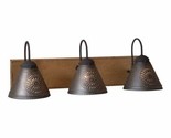 Here is a new classic country lighting fixture designed to illuminate your bathroom, This is called the Crestwood vanity light and it is made of wood and has attached punched tin shades,It has a handpainted and slightly distressed plantation red wooden back with black textured arms and crimped pans,It is Direct wired with three Medium (Standard) sockets, each taking up to 60 watt max. bulbs per arm. (Bulbs not included) it has Black textured arms with crimped pans, and punched kettle black tin shades, And it is Handcrafted in United States, This light is UL-CUL approved also. Below is full Description, this would accent any bathroom or powder room nicely, and also check out my many other nice lighting and Decor.