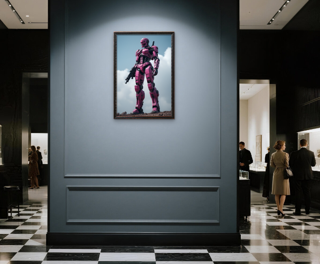 Unleash futuristic power and bold style with this striking artwork of a high-tech combat android clad in vibrant pink armor. Standing tall against a dramatic sky, this mech exudes dominance, confidence, and unstoppable strength. Every metallic detail—from the reinforced joints to the illuminated eyes—brings this warrior to life with cinematic intensity.