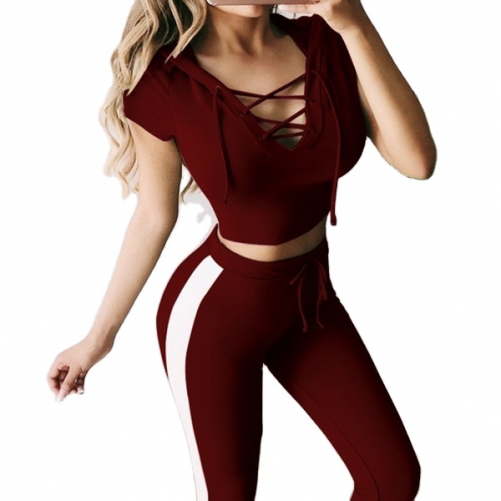 - Crop Top Hoodie and Pants Set Matching Two Piece Tracksuit - Burgundy