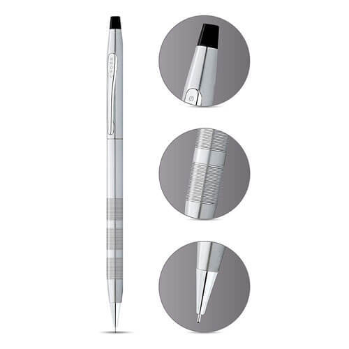 The Cross Classic Century Satin Chrome Pencil with 0.7mm Lead. Cross Satin chrome mechanical pencil is made with Cross Ionic Design and Satin Chrome finish. It has swivel-action propel/repel featuring its tip and conical cap that denotes the technology. It uses 0.7 mm pencil technology and is an icon of American design and innovation.