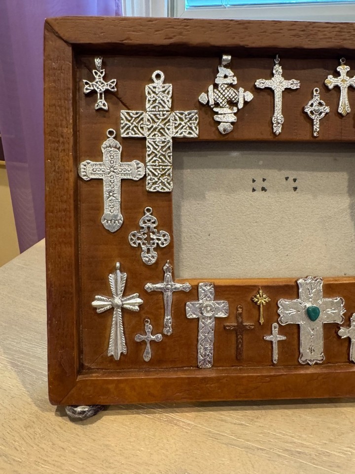 This frame features 24 unique variations of raised, high-relief metal intricate and detailed cross designs.