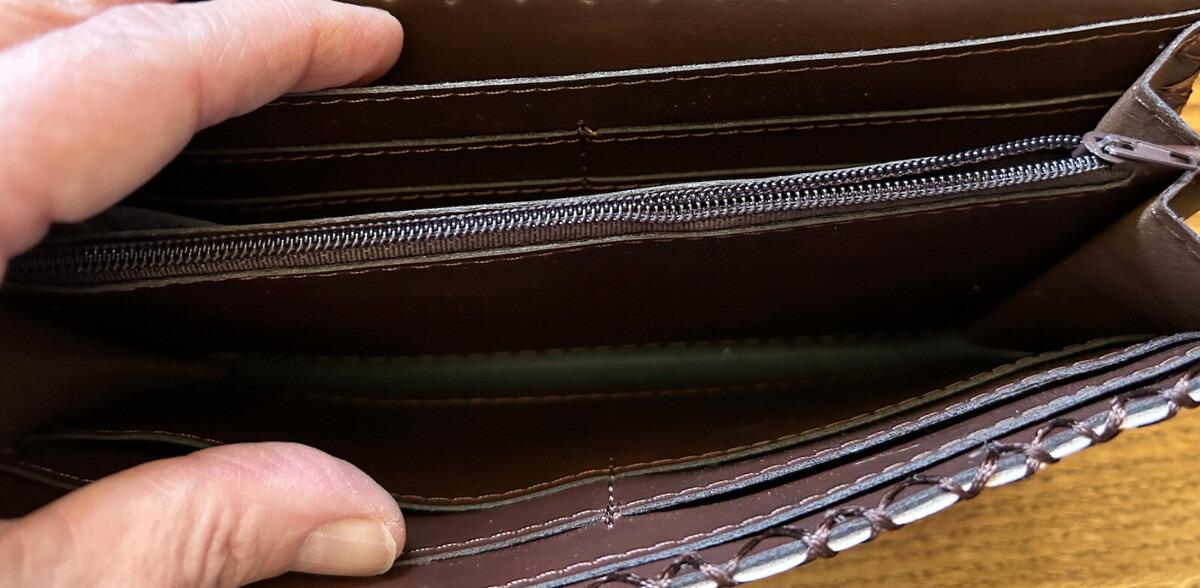 pockets (one is zippered) with slot for credit cards. Snap close. Each is hand-stitched and measures approximately 7.75 x 4.25 inches. The stunning dragonfly will have fun flying around your purse.