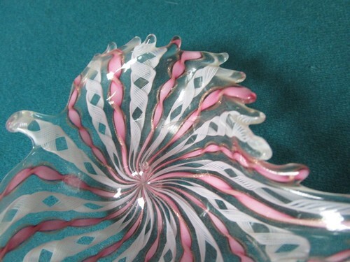 - Crystal Venetian Vanity Dish Leaf Shaped Pink And White Waved & Roped Design