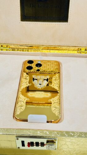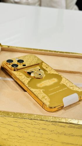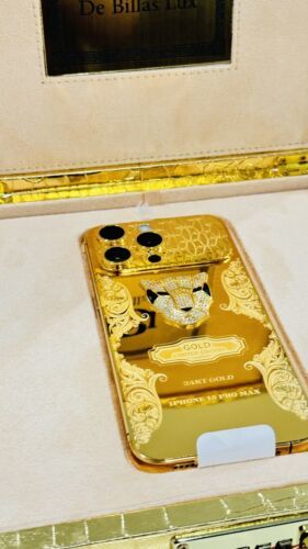 - Authentic iPhone 15 Pro Max 1 TB - Customized PANTHER Design and electroplated with real 24K Gold, this iPhone has Diamond Rhinestones crystals incrustations in the housing and an engraved design. Not a case, the actual iPhone has been customized.