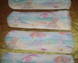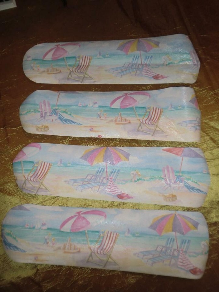 Brand new in the box 42" white flushmount style ceiling fan with single school house style light. Only the blades have been removed to be hand decorated with very pretty soft watercolor oceanside view. Beach chairs, umbrellas, sand castles and more.