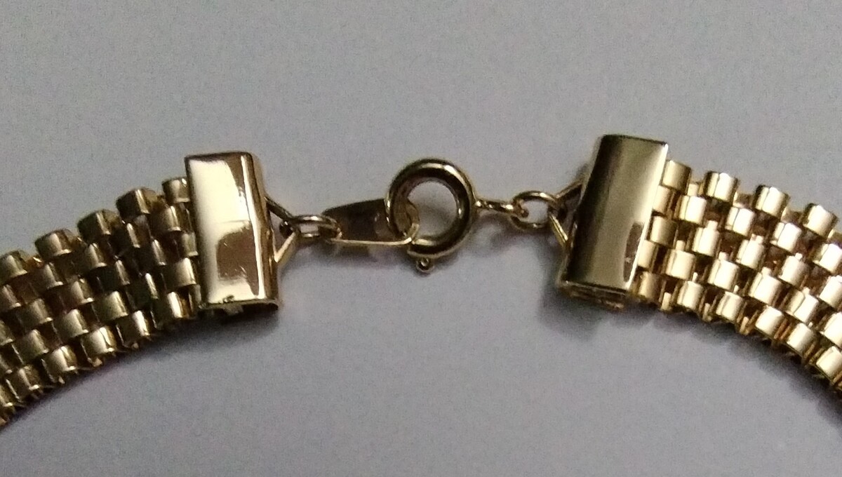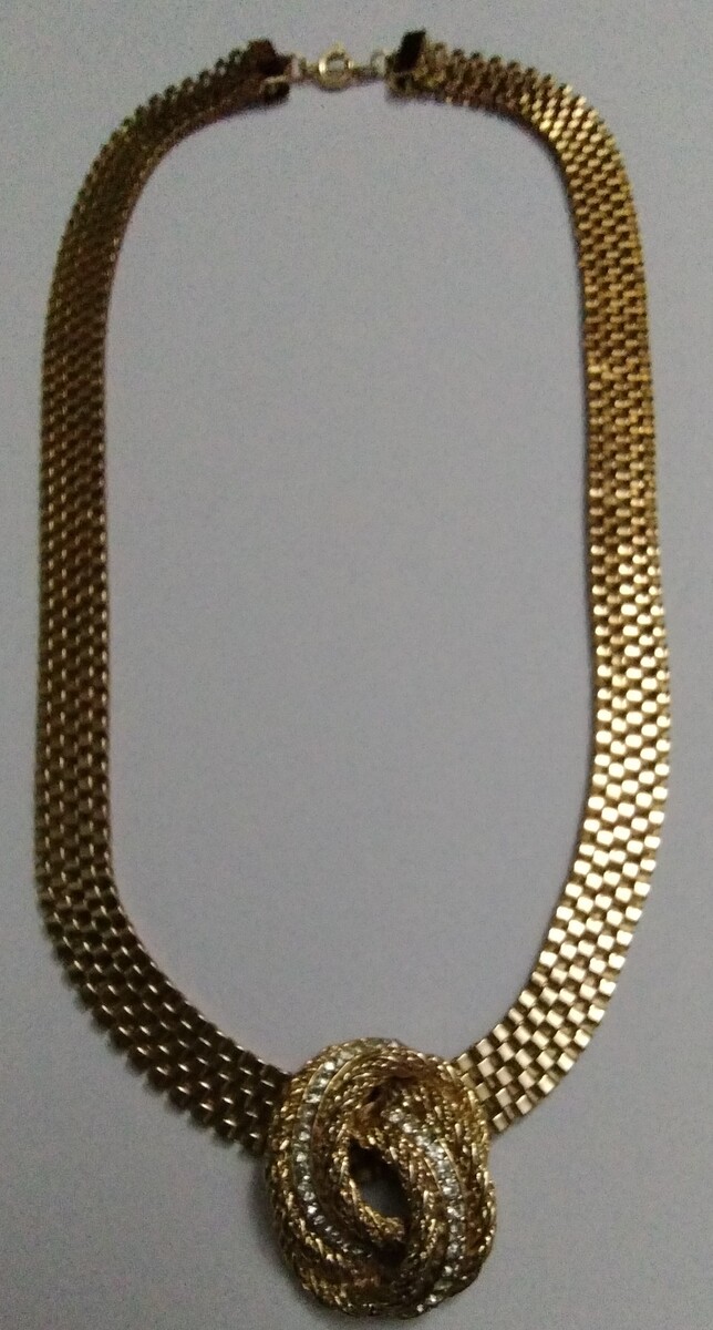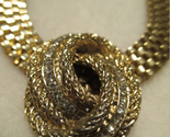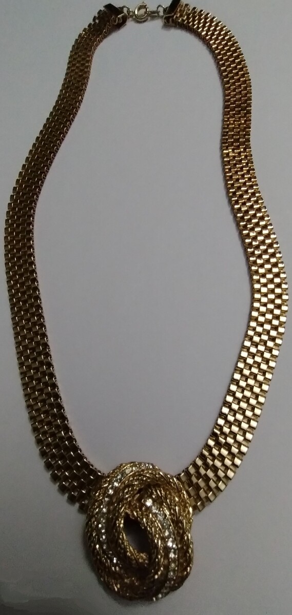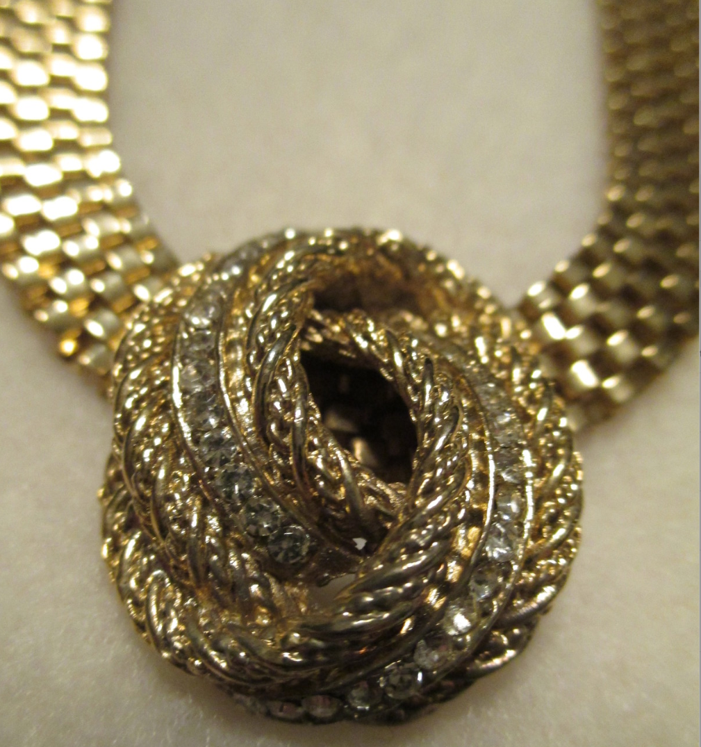 This gorgeous gold plated, textured rope knot with round-cut Swarovski crystals, earring has been professionally mounted on a comfortable 3/8" by 16" flat mesh chain with a spring ring closure. The unsigned (only because the signature was on the clip) designer pendant measures 1-1/8" tall and 1" wide.