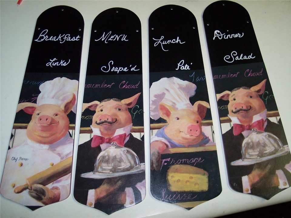 Only the blades have been removed to be hand decorated with fabulous pig chef, waiter, server, chalkboard menu theme. Blades are then sealed with a polyacrylic to protect the finish. Graphics are randomly placed. There are 3 different chef designs and any one of them could be the one used twice.