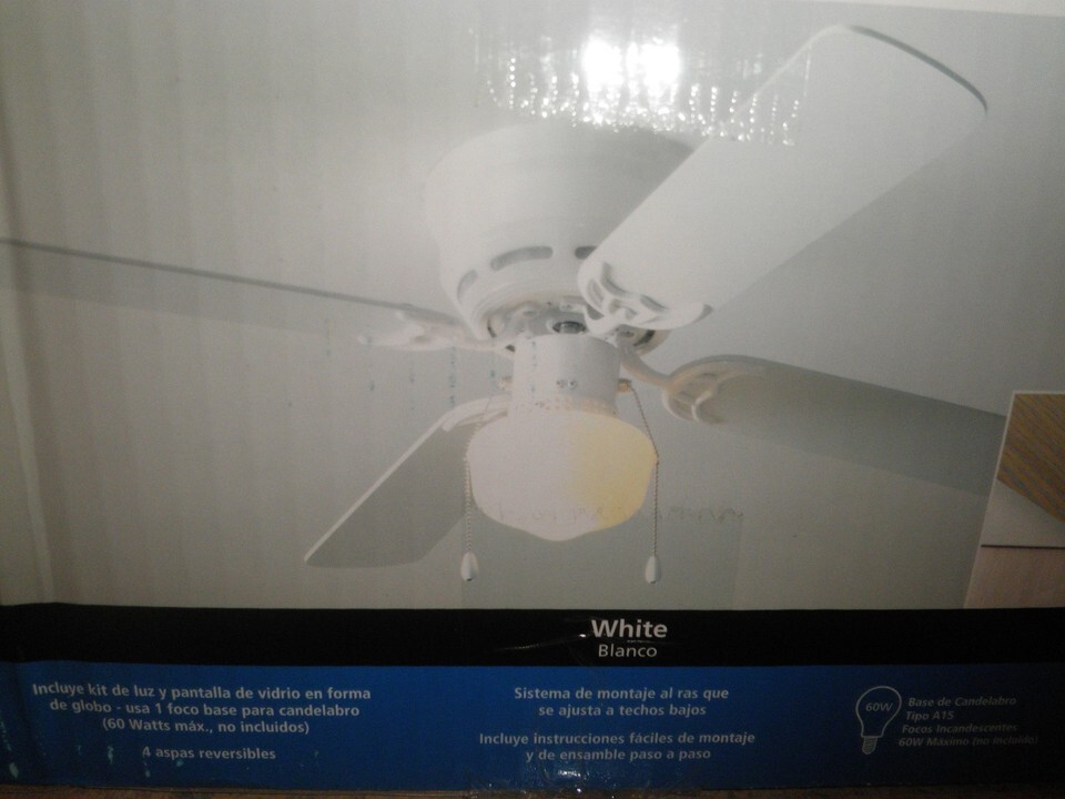 Brand new in box 42" wallhugger flushmount style ceiling fan with 4 blades and single schoolhouse style light kit attached.