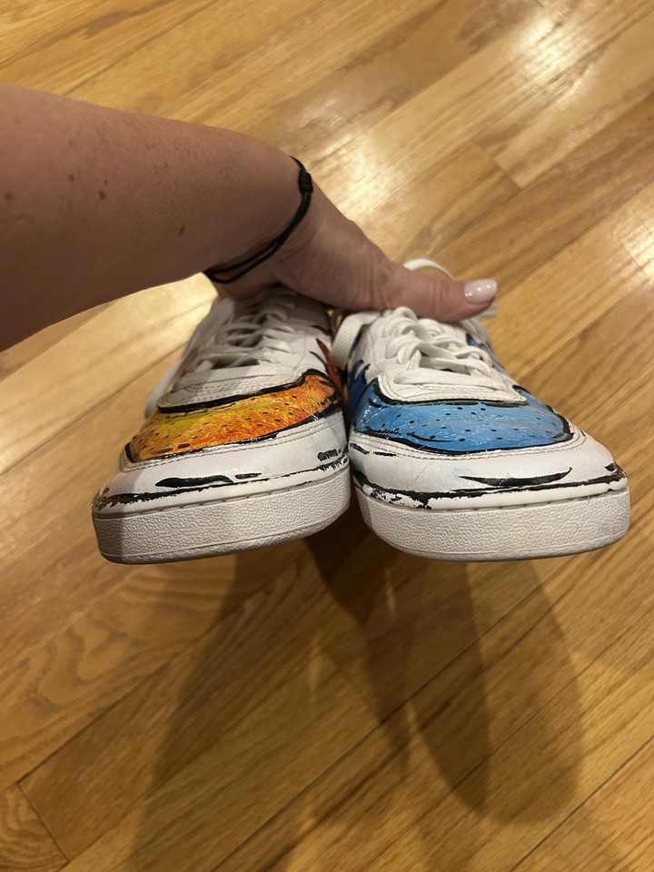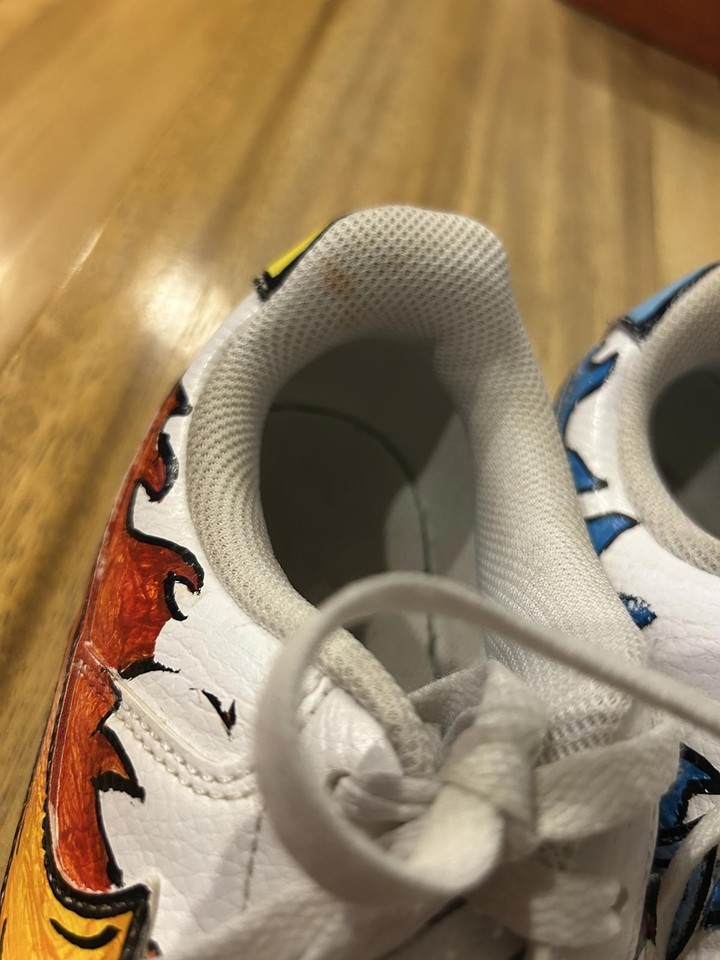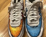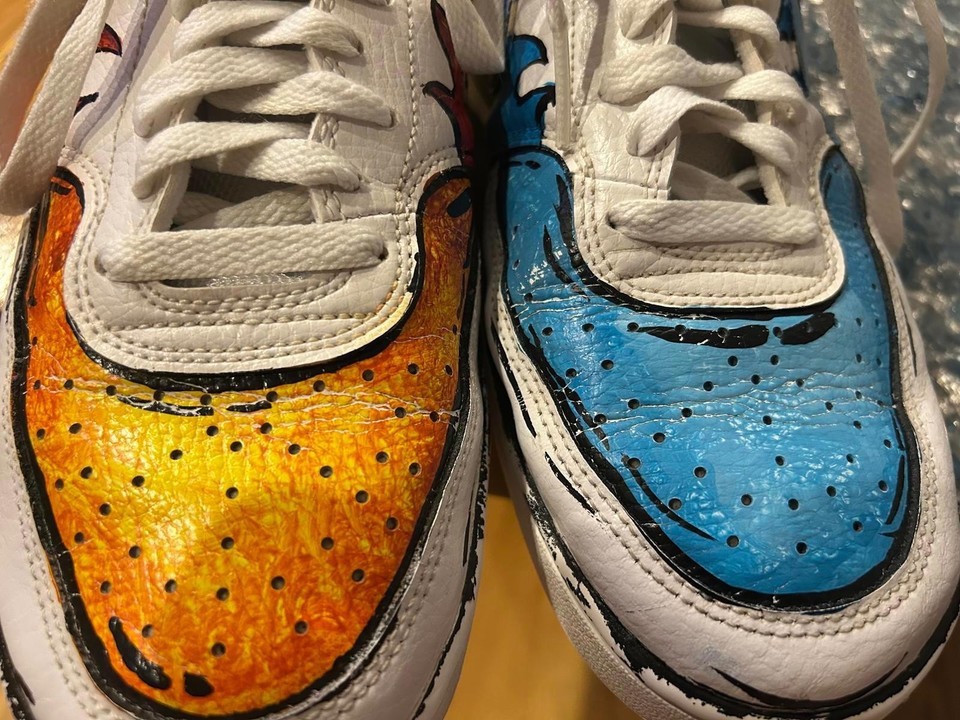 Step into style with these unique custom painted Nike sneakers, featuring a vibrant flame and wave design. Perfect for those who want to stand out, these sneakers showcase a playful mix of colors. Key features include: