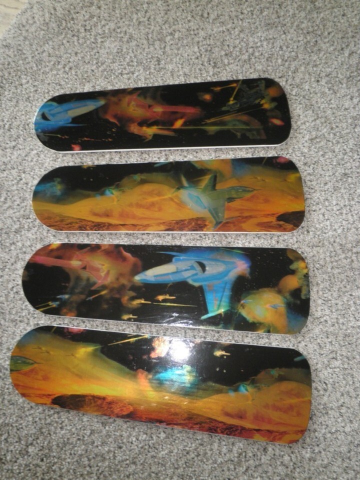 Brand new in the box 42" white wallhugger flush mount ceiling fan with single schoolhouse style light kit attached. Only the blades have been removed to be handcrafted with stunning metallic Galaxy Outer Space graphics. Graphics are randomly placed making each fan unique