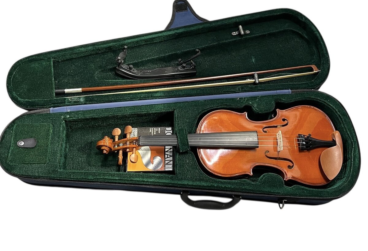 Type: ViolinBrand: CustomModel: UnbrandedSize: 4/4Color: NaturalNumber of strings: 4Material: WoodCase included: yesCondition:UsedNotes:Includes bow, should rest, 2 packages of strings.