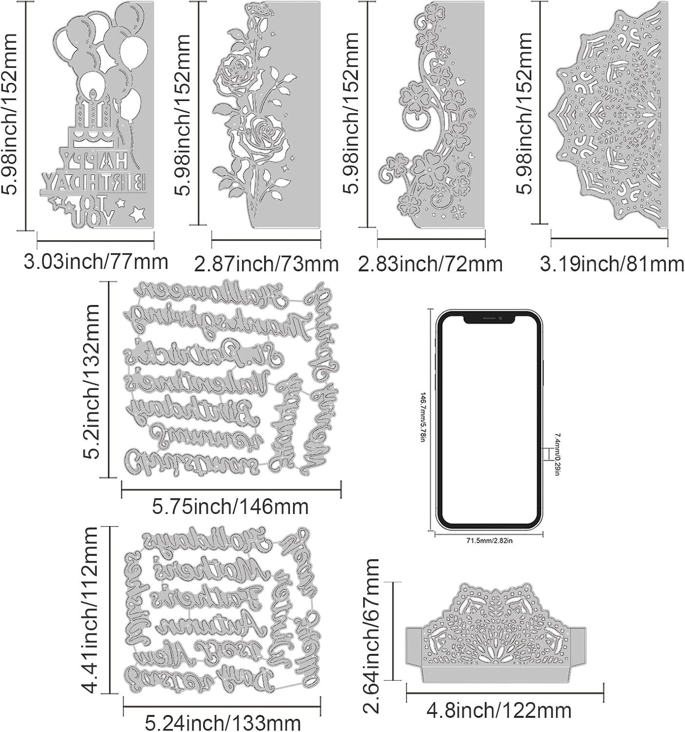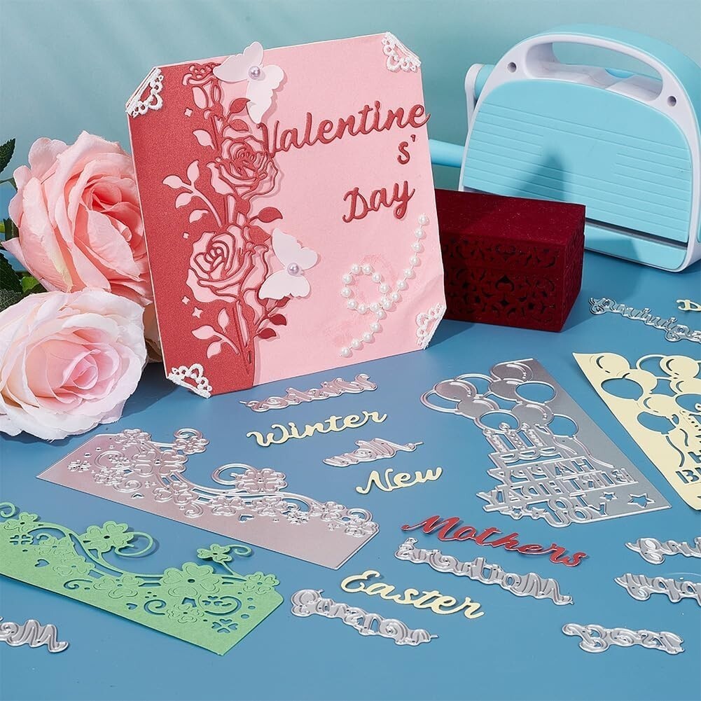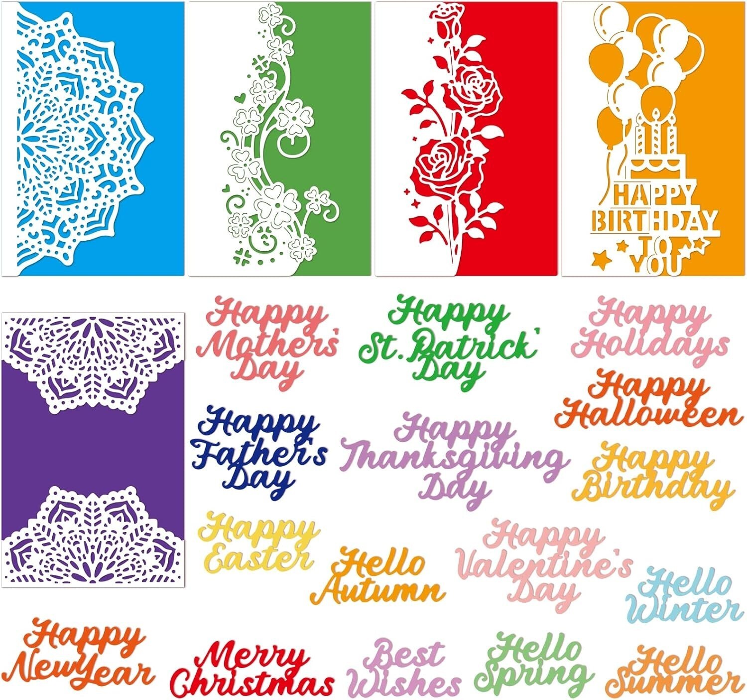 Discover our versatile DIY Die Cut Set, featuring 5 intricately designed flower lace border cutting dies including mandala, roses, St. Patrick's clover, and a Happy Birthday balloon. This set also encompasses a variety of word dies such as Happy Birthday, Happy Easter, Happy St. Patrick's Day, Happy Father's Day, Happy Mother's Day, and Happy New , perfect for customizing your greeting cards and crafts.