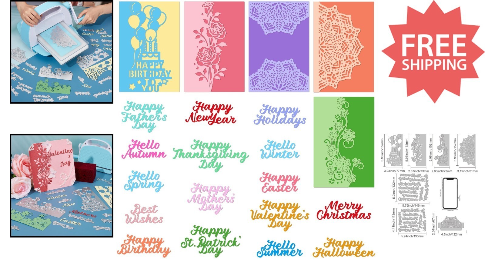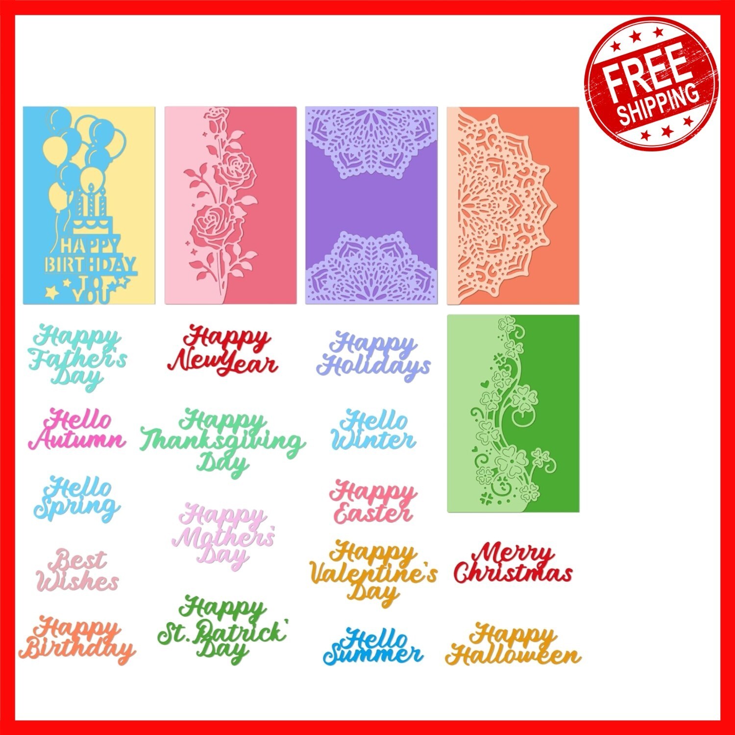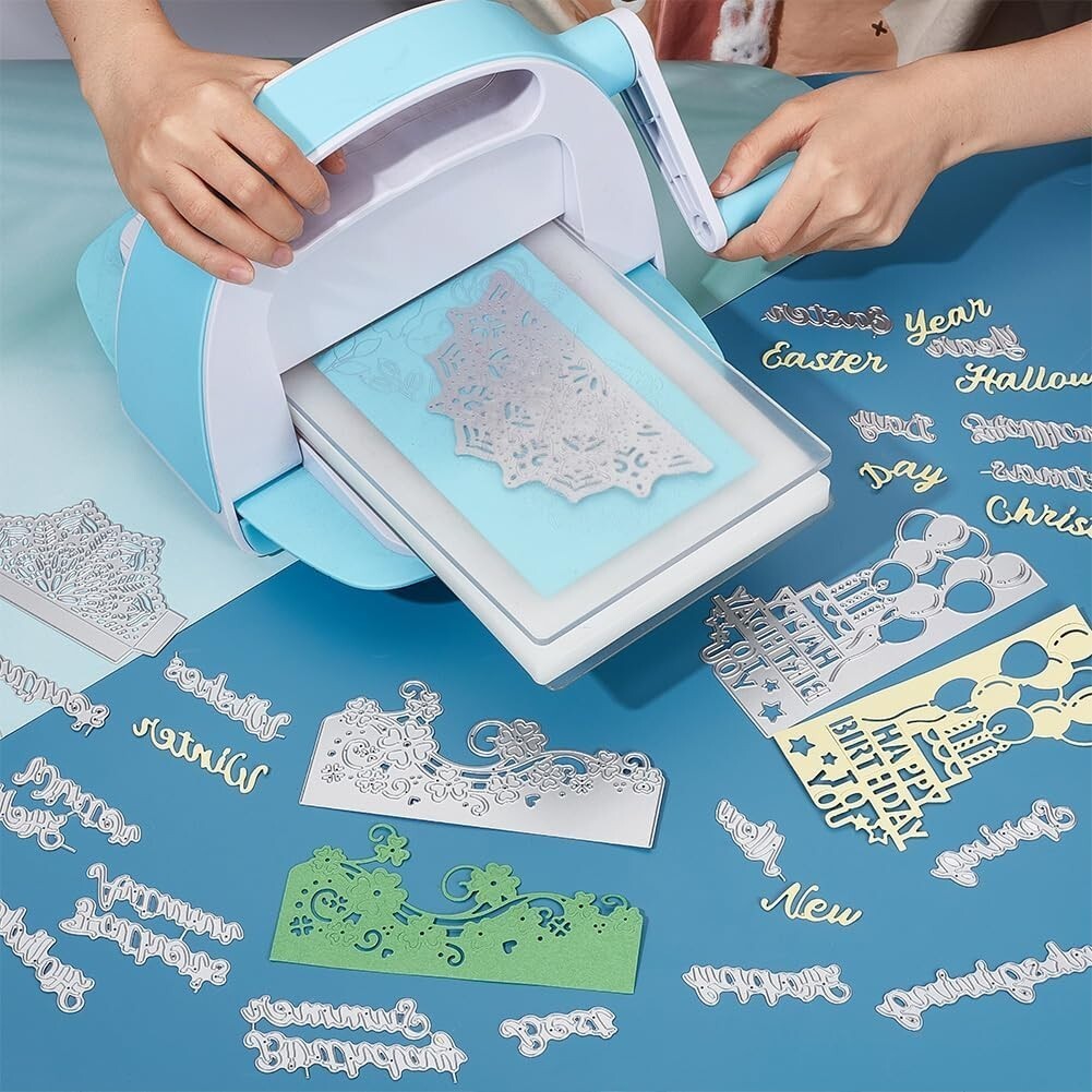 Discover our versatile DIY Die Cut Set, featuring 5 intricately designed flower lace border cutting dies including mandala, roses, St. Patrick's clover, and a Happy Birthday balloon. This set also encompasses a variety of word dies such as Happy Birthday, Happy Easter, Happy St. Patrick's Day, Happy Father's Day, Happy Mother's Day, and Happy New , perfect for customizing your greeting cards and crafts.