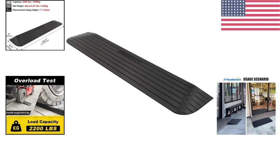 Experience unrivaled safety and performance with our Heavy-Duty Rubber Threshold Ramp, designed for your convenience. Made from high-quality rubber, it promises excellent grip and stability, allowing safe passage for mobility aids in any season. Its customizable design means it can fit any threshold, while its robust construction ensures it can hold an impressive load capacity of 2200lbs.