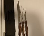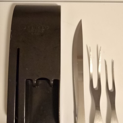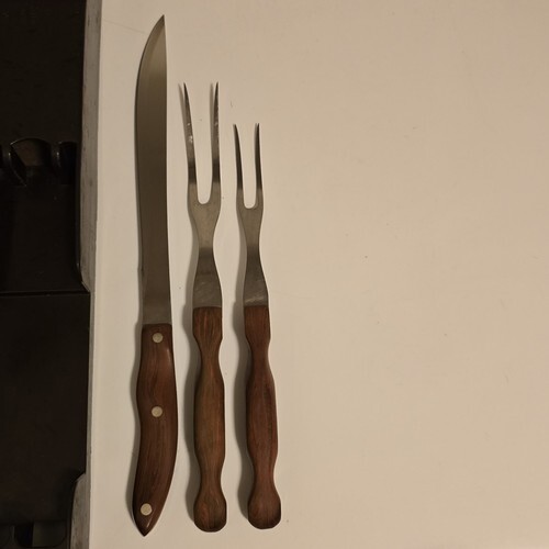 Great pre-owned Condition Cutco No. 23 9" Blade Carving Knife 1 No. 27 11.5" Carving Fork + 1 Smaller Unmarked 10.5" Carving / Serving Fork. Comes in a Cutco 3 Pc. Rack.