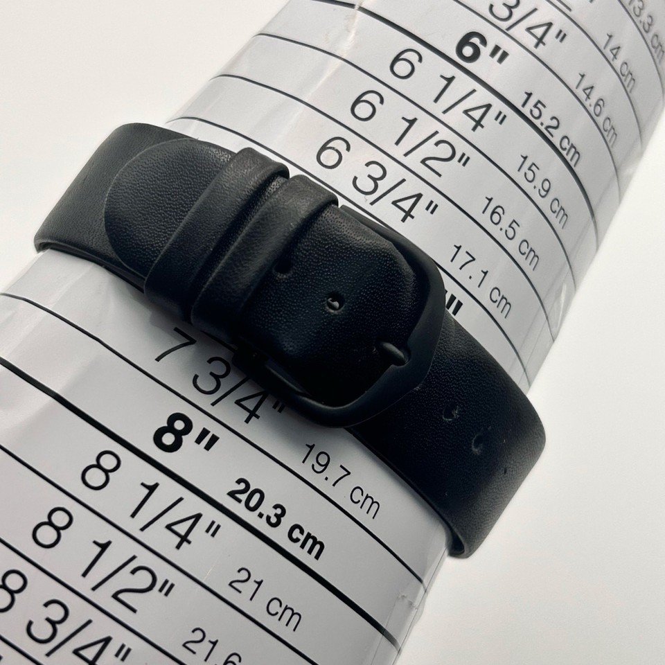 The watch has a 38mm case and a sleek black leather band that complements any outfit.