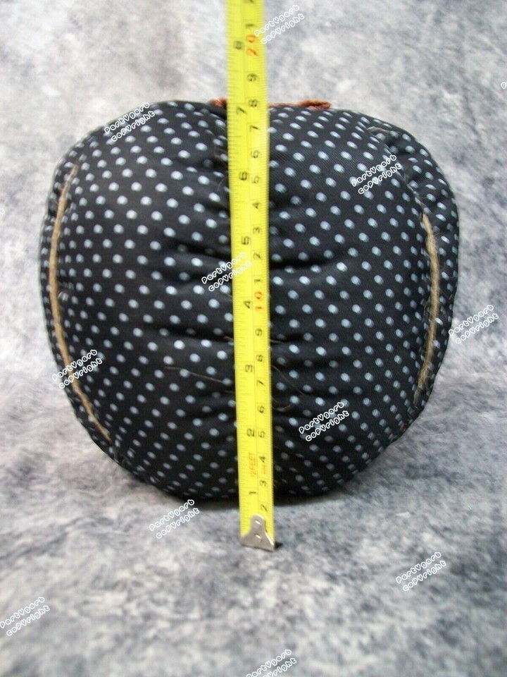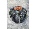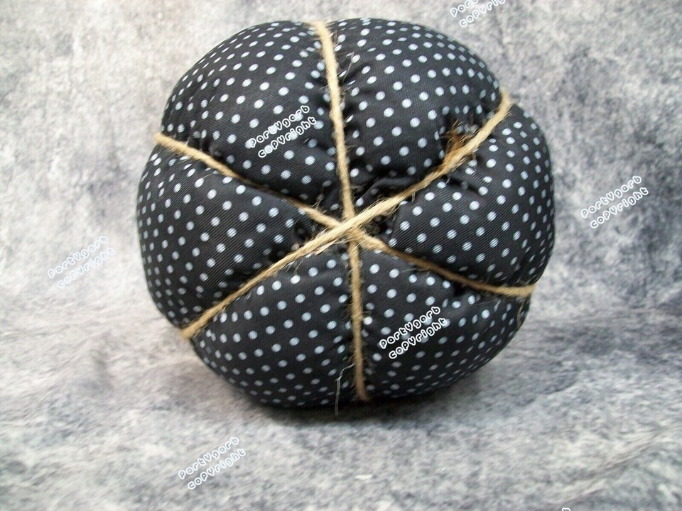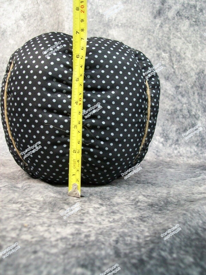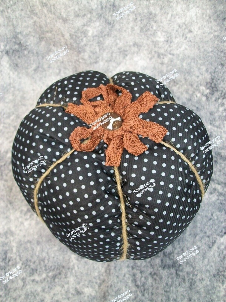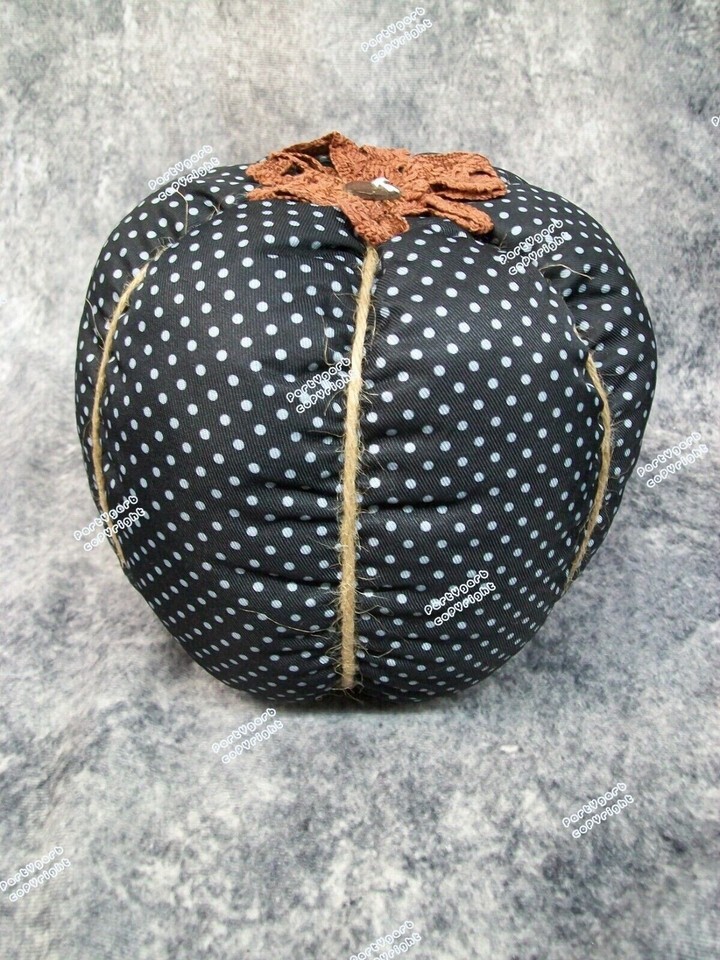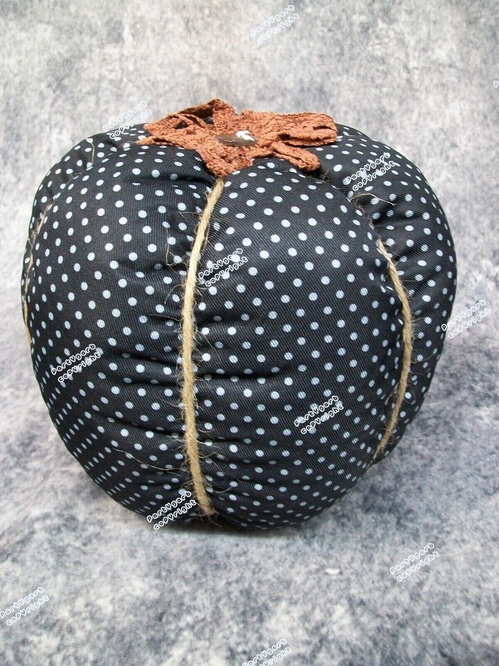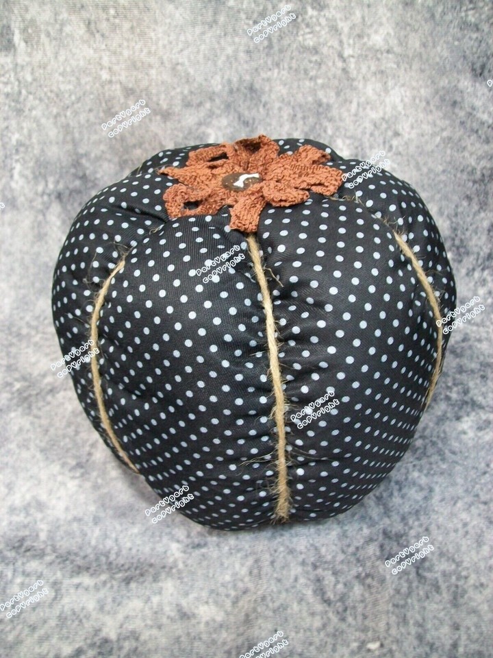 Cute Fun Polka Dot Decorative Pumpkin. Halloween Decoration. Wrapped with twine to create the lobes. Crocheted Lace at the top with a button. Plush Filled. Pumpkin is kind of an odd shape but that gives it a whimsical look. Material picks up lint easily.