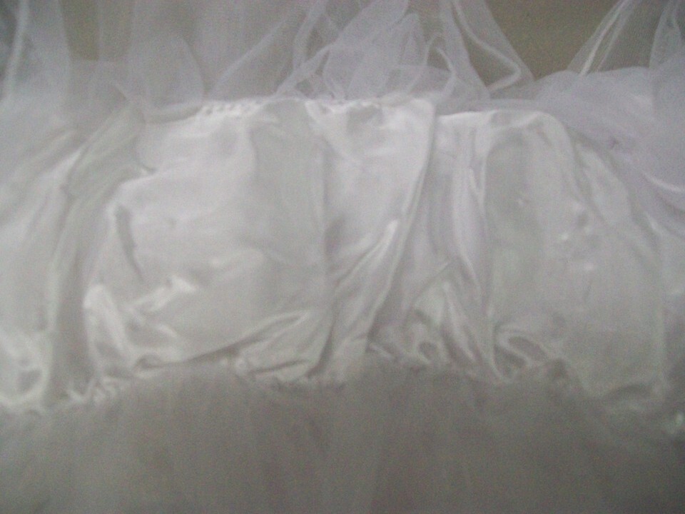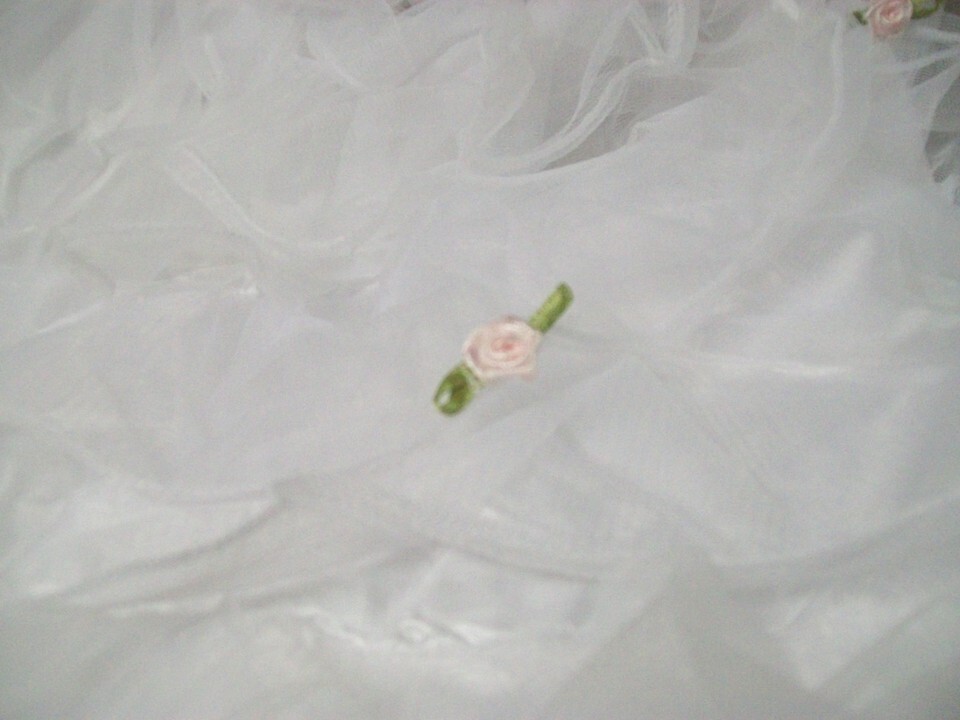 flowers on the dress. White Satiny like Dress with spaced Tulle like ruffles
