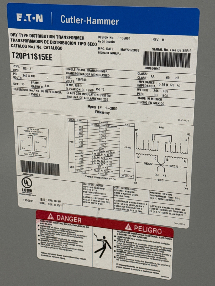 - Cutler-Hammer T20P11S15EE One-Phase Transformer, 15kVA