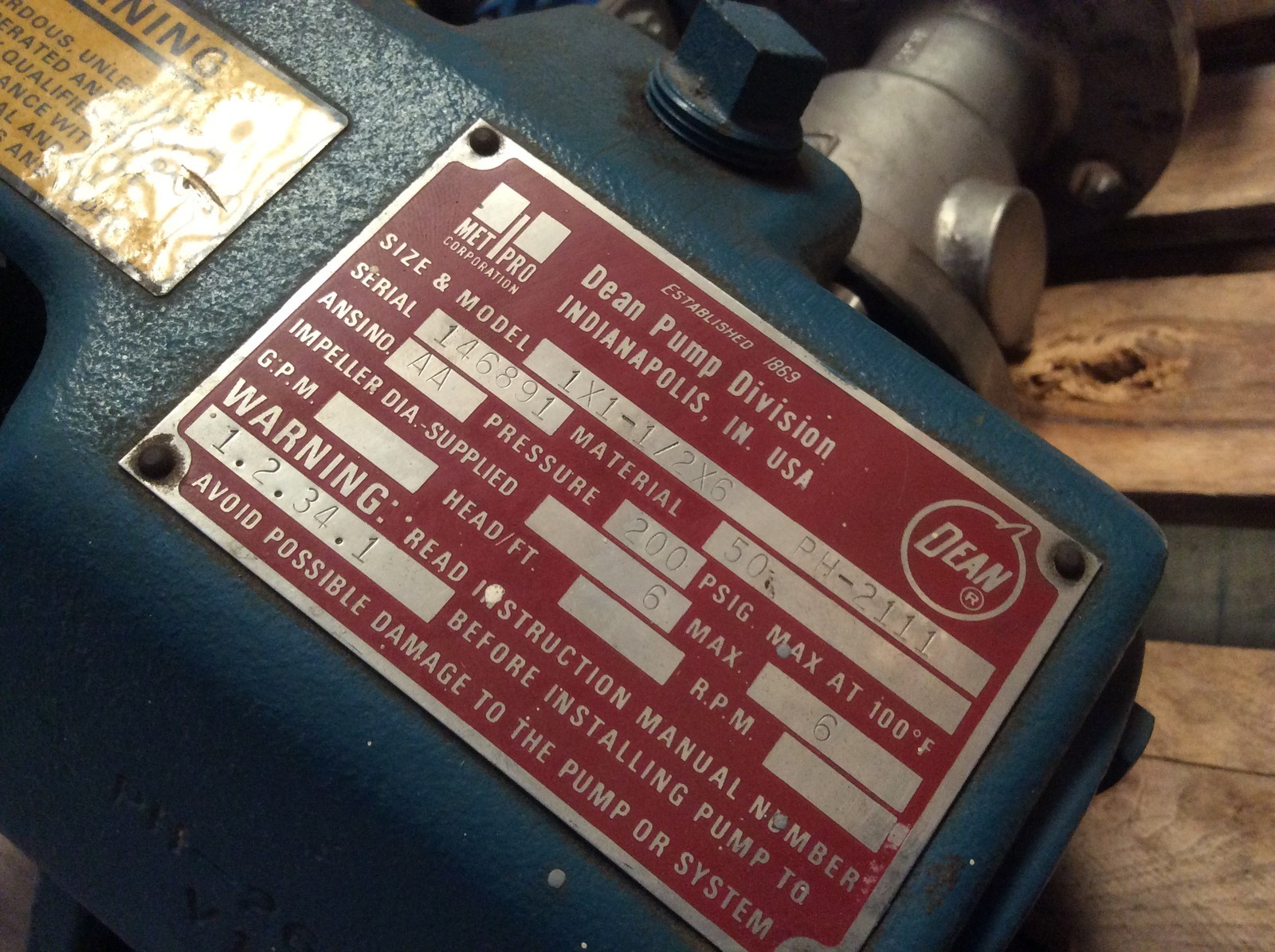 - DEAN BROS CHEMICAL PROCESS PUMP PH-2111 1X1-1/2X6 AA 200 PSIG NEW $299