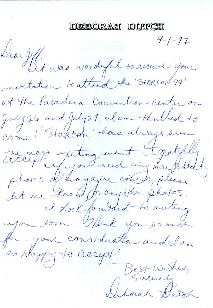 1990’s scream queen cutie Deborah, known for such fun titles as SORORITY GIRLS AND THE CREATURE FROM HELL, BIKINI DRIVE-IN and ATTACK OF THE 60-FOOT CENTERFOLD, accepts the invitation to a 1997 Pasadena, California, sci-fi convention in this personal letter. It accompanies an embossed b/w 8x10 talent agency portrait.