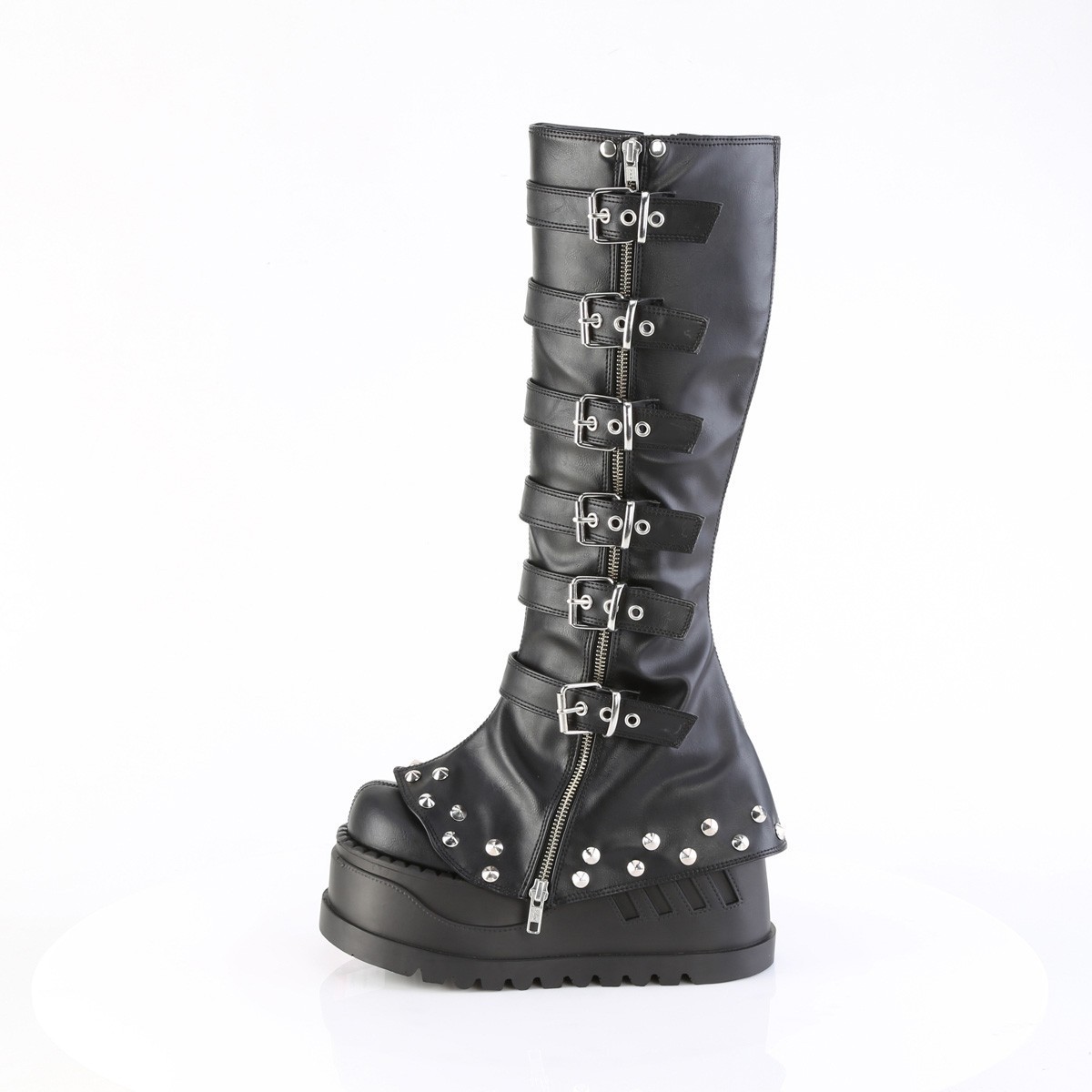 - DEMONIA STOMP-223 Women's Black Wedge Platform Studs Buckles Black Knee Boots 8