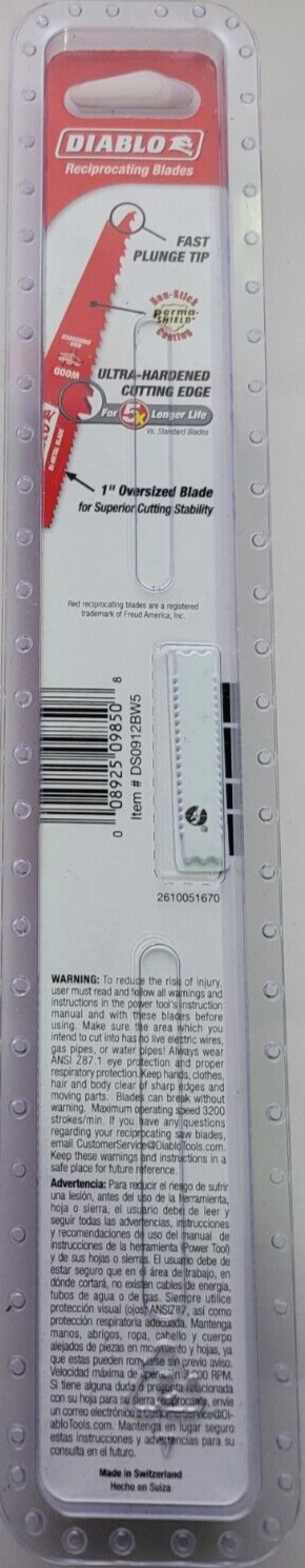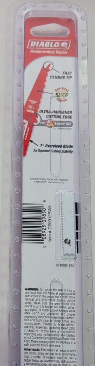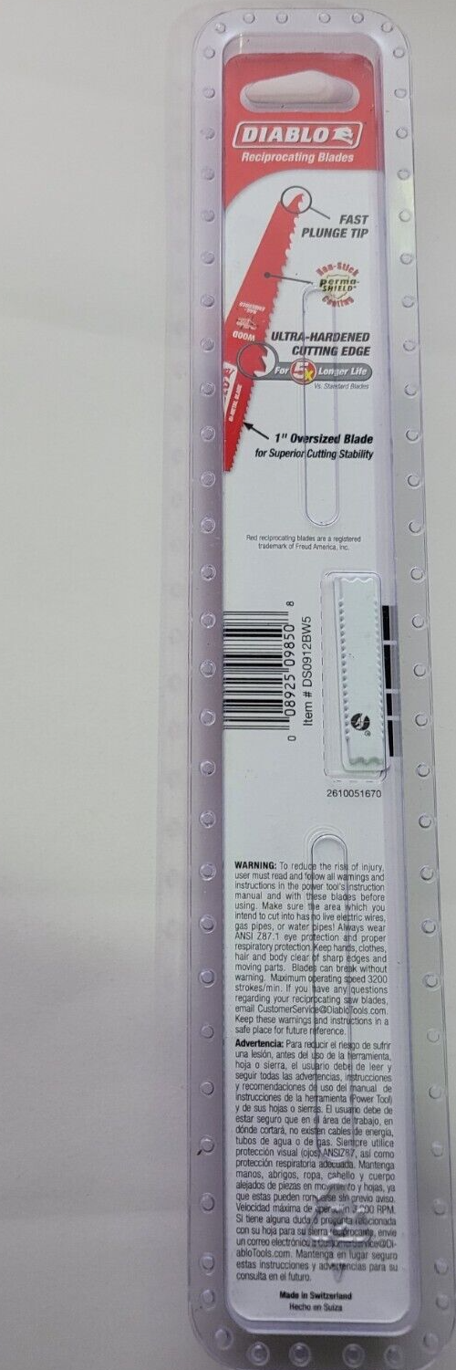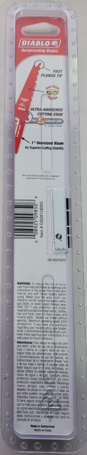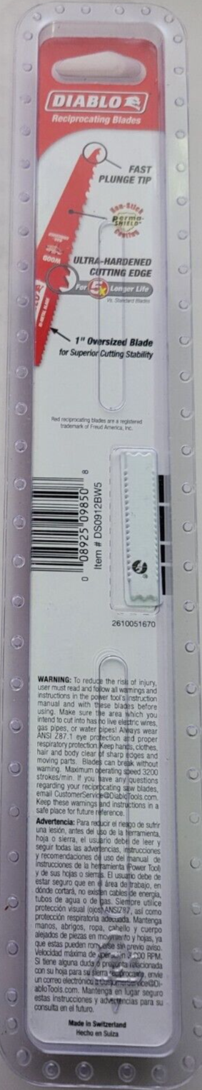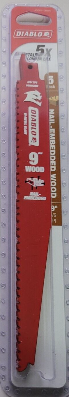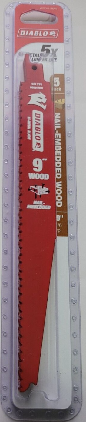 You are Buying Brand New And Factory Sealed DIABLO 9 in. 4/6 TPI Demo Demon Bi-Metal Reciprocating Saw Blades for Nail-Embedded Wood Cutting (5-Pack) Model # DS0912BW5.....blade's Full Contact Arched Edge Design with ultra-hardened cutting edge provides faster cuts in fewer passes resulting in less heat build-up to deliver 5X longer cutting performance