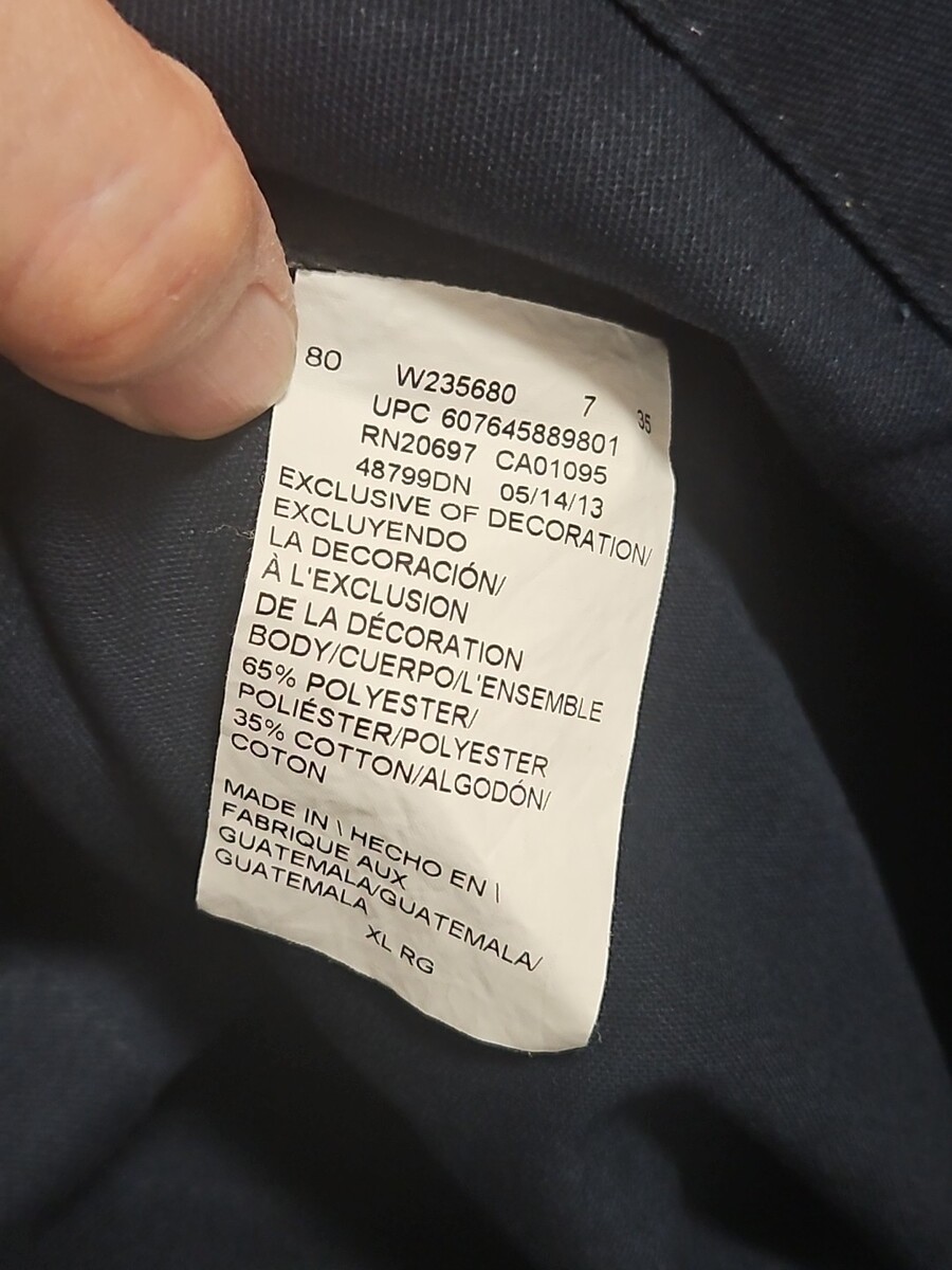 The product is a pair of Dickies long sleeve coveralls in a dark navy color, designed for men in size XL. Made from a blend of polyester and cotton, these coveralls are suitable for a mechanic occupation. They are of American origin and have no personalization options available. Perfect for those looking for durable and comfortable work clothing that is both practical and stylish for various industrial settings. Worn once