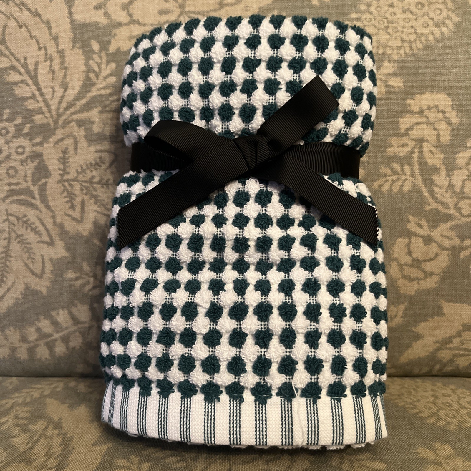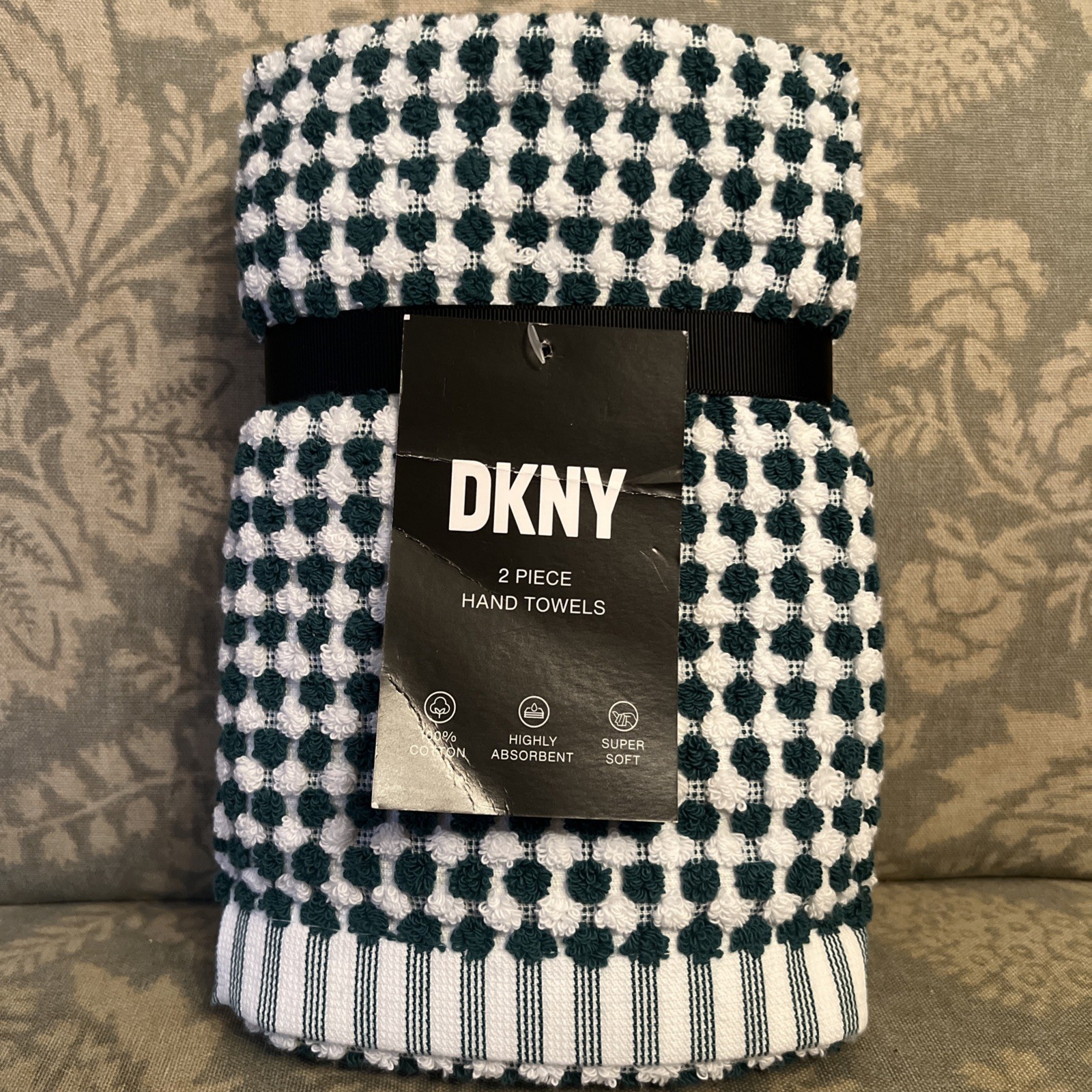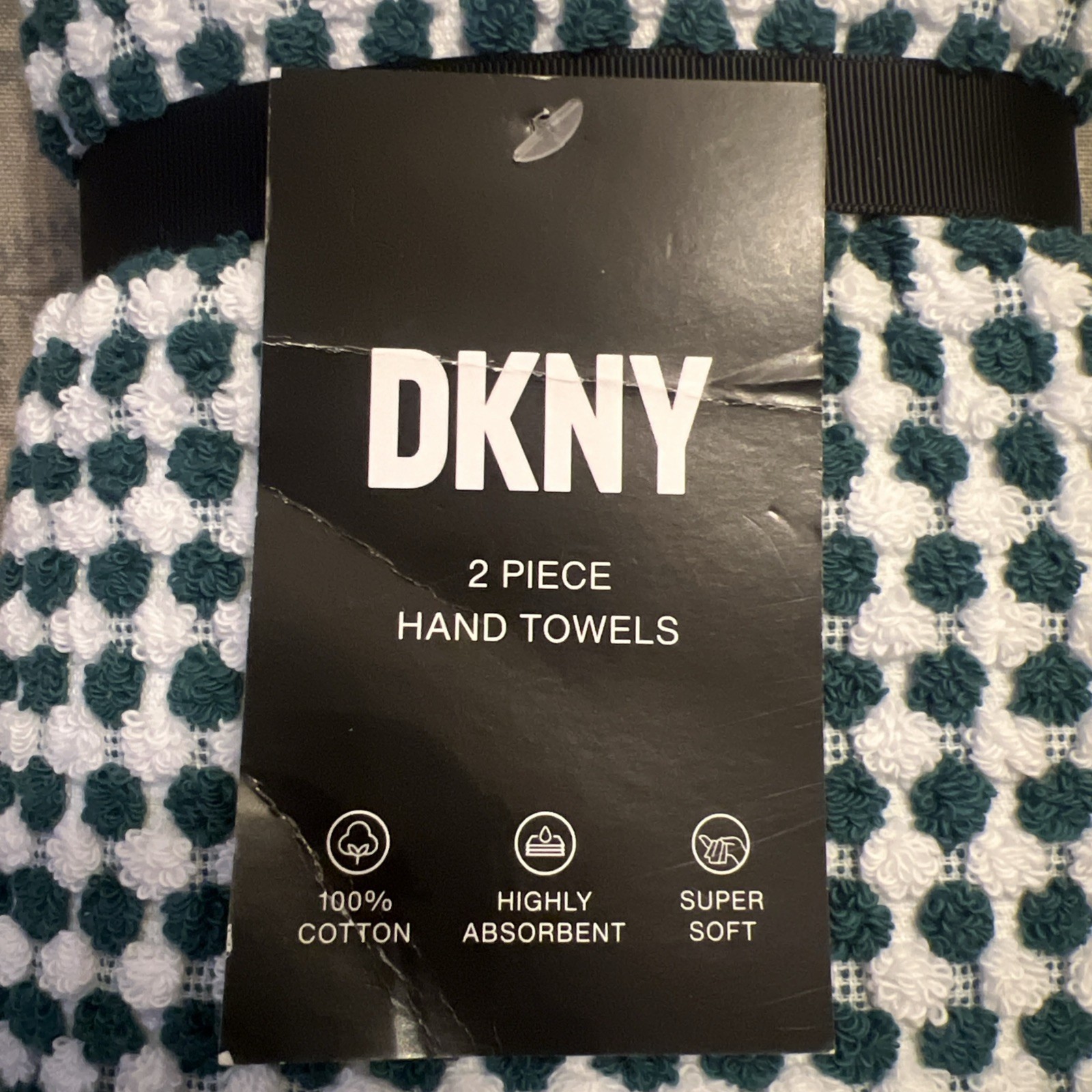 - DKNY Polka Dot Gingham Check Pine Green White Hand Towels Set 2 ~New ~