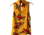 Bright and cheerful sleeveless blouse by DNA Couture featuring a vivid yellow background with bold red rose print. The top has a mock neck with keyhole front and back for a flattering fit, and includes its original spare button in a clear bag attached inside the neckline (see photo). Perfect for layering or summer wear.