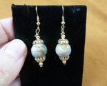 (internal #DP1-23z) This is a beautiful pair of Genuine Dinosaur poop dangle earrings made with one 12mm bead and gold alloy beads and filigree cap accents, on gold alloy hypoallergenic French wires.