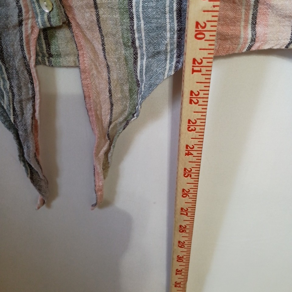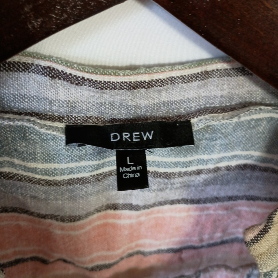 The DREW Sleeveless Striped Button Up Tie Front Blouse Top in multicolor, size Large, is a stylish and versatile addition to any woman's wardrobe. Made from a blend of linen and rayon, this lightweight top features a flattering V-neckline, sleeveless design, and button closure. The tie front detail adds a unique accent to the top, making it perfect for casual occasions during the summer and spring seasons. The Drew brand and Anthropologie theme give this blouse a touch of sophistication and charm, ideal for a variety of stylish looks. Normal wear.