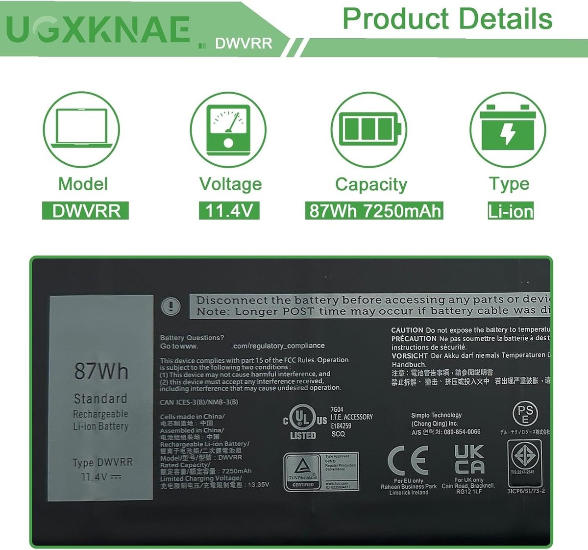 This 6-cell DWVRR 11.4 V 87 Wh lithium-ion battery restores full runtime to Dell Alienware x15/x17 (R1 R2) and Inspiron 16 7620 2-in-1 laptops. Engineered to match OEM performance, it provides consistent power output for gaming and workstation-level workloads.