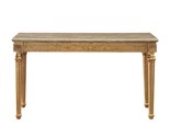 Features: Rectangular Leg Sofa Table No Storage (Open Base) Marble Top: Spain Import Marble with MDF Wooden Apron with Corner Carved Floral Motifs: Antique Gold Finish, Poplar Wood Wooden Turned Legs with Fluted Details: Antique Gold Finish, Poplar Wood Set Includes: One (1) Sofa Table